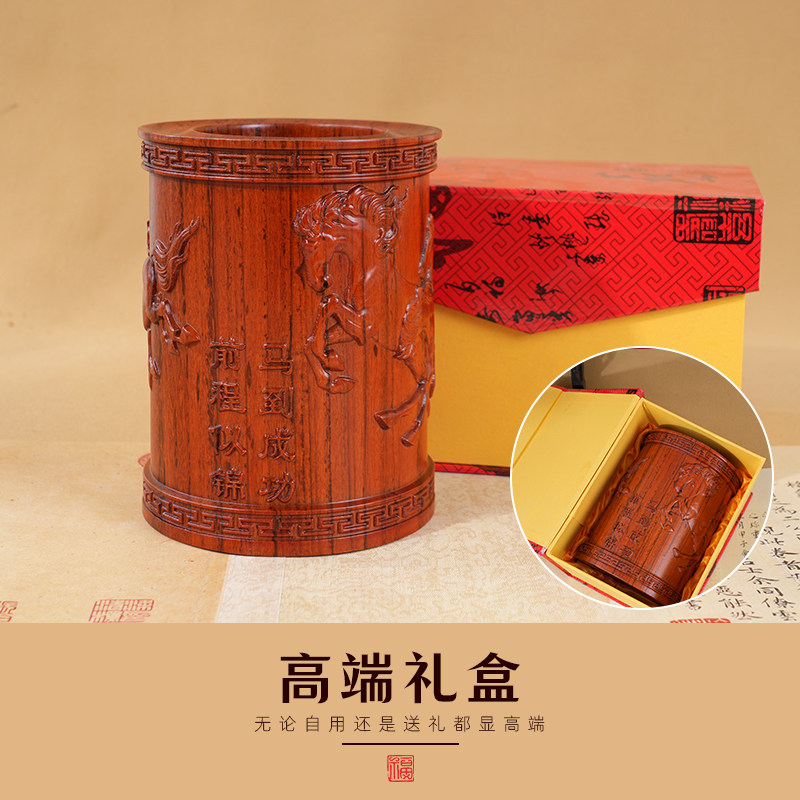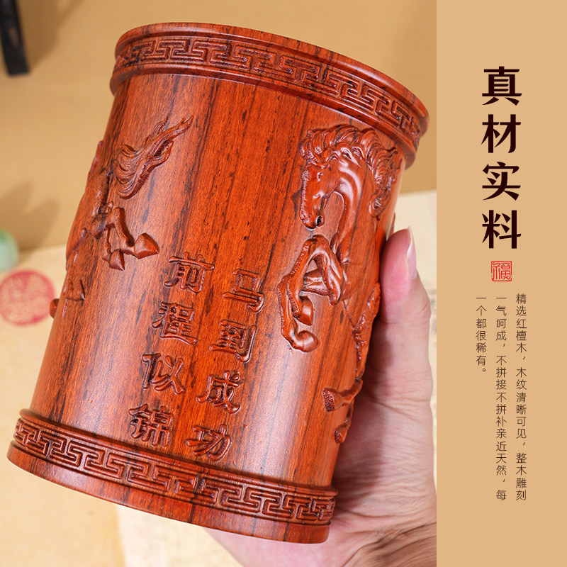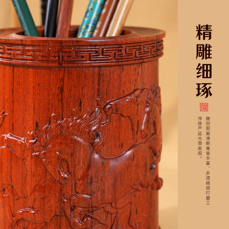 轩义堂红檀木八骏图笔筒木头手工艺品原木摆件实木雕刻木制红檀木质笔筒毛笔笔筒书房桌面收纳筒高档实木摆件