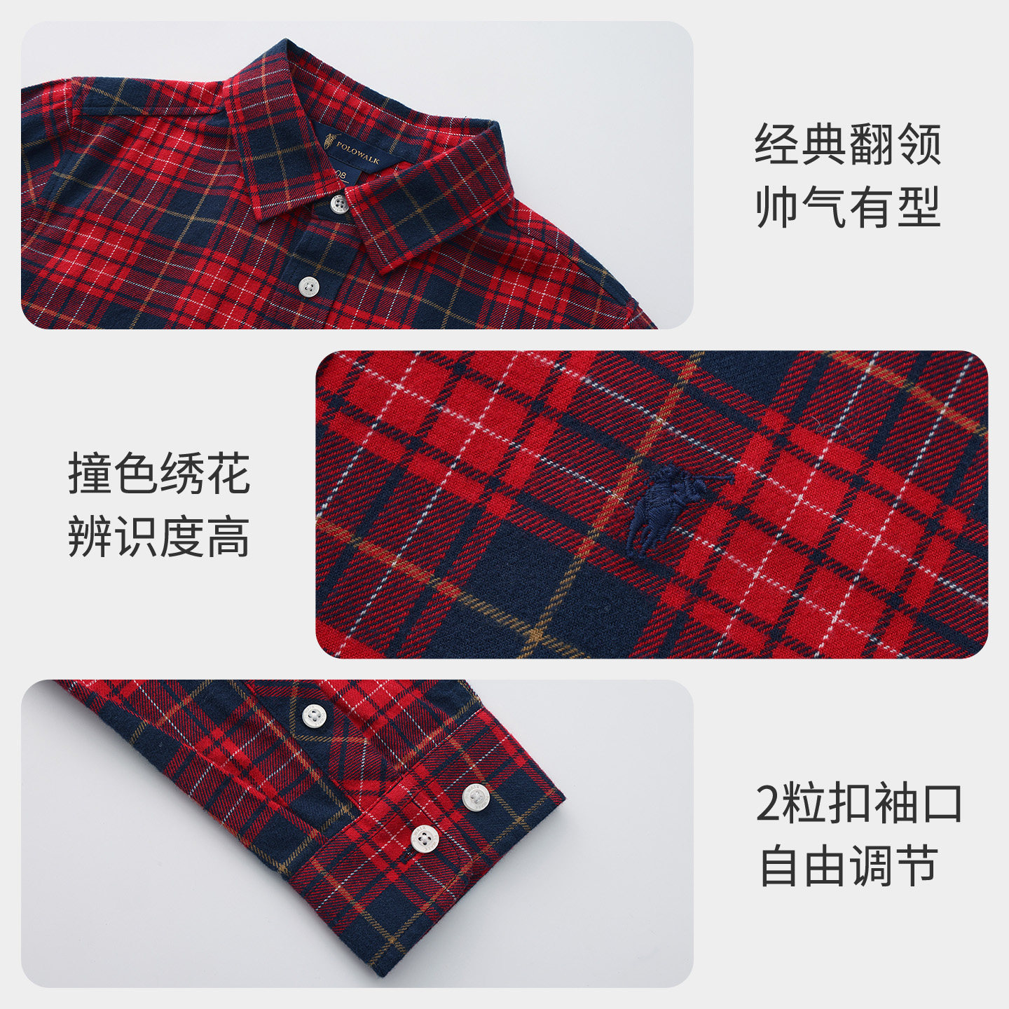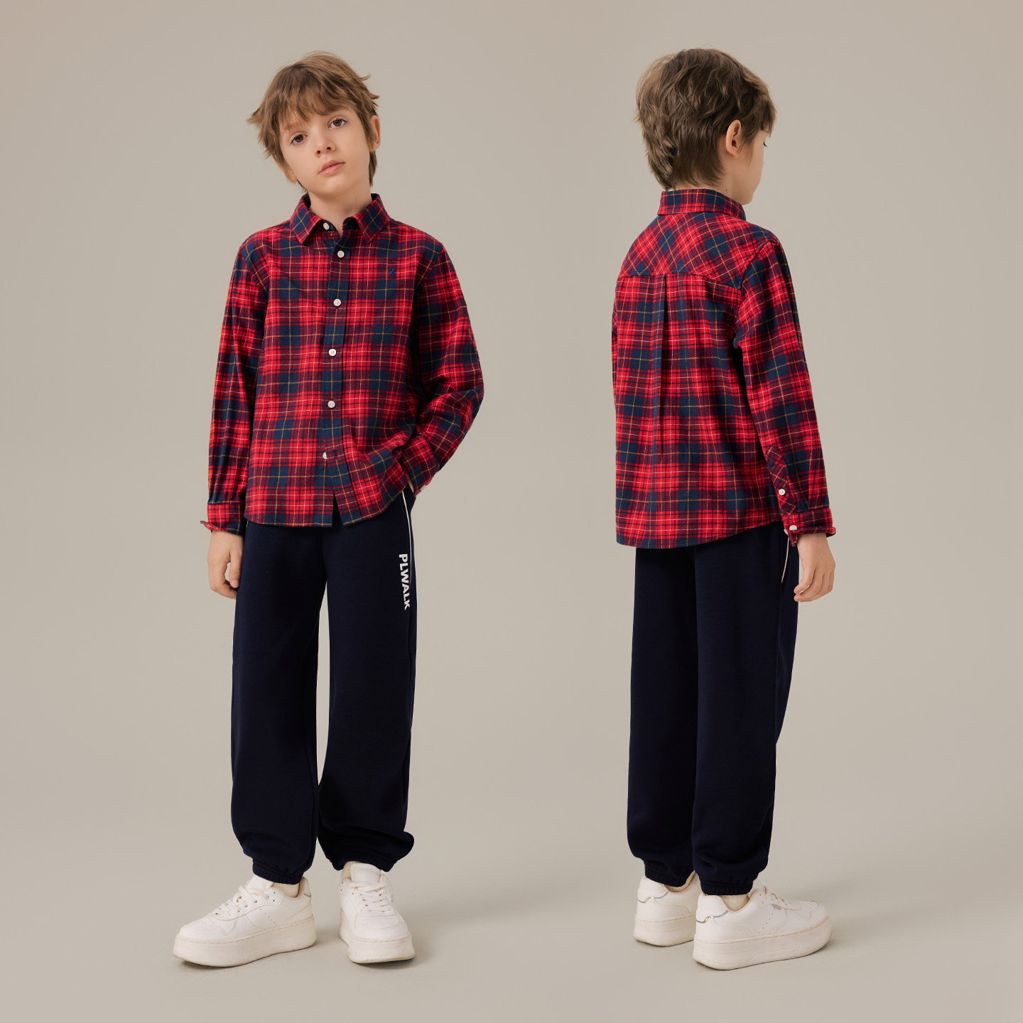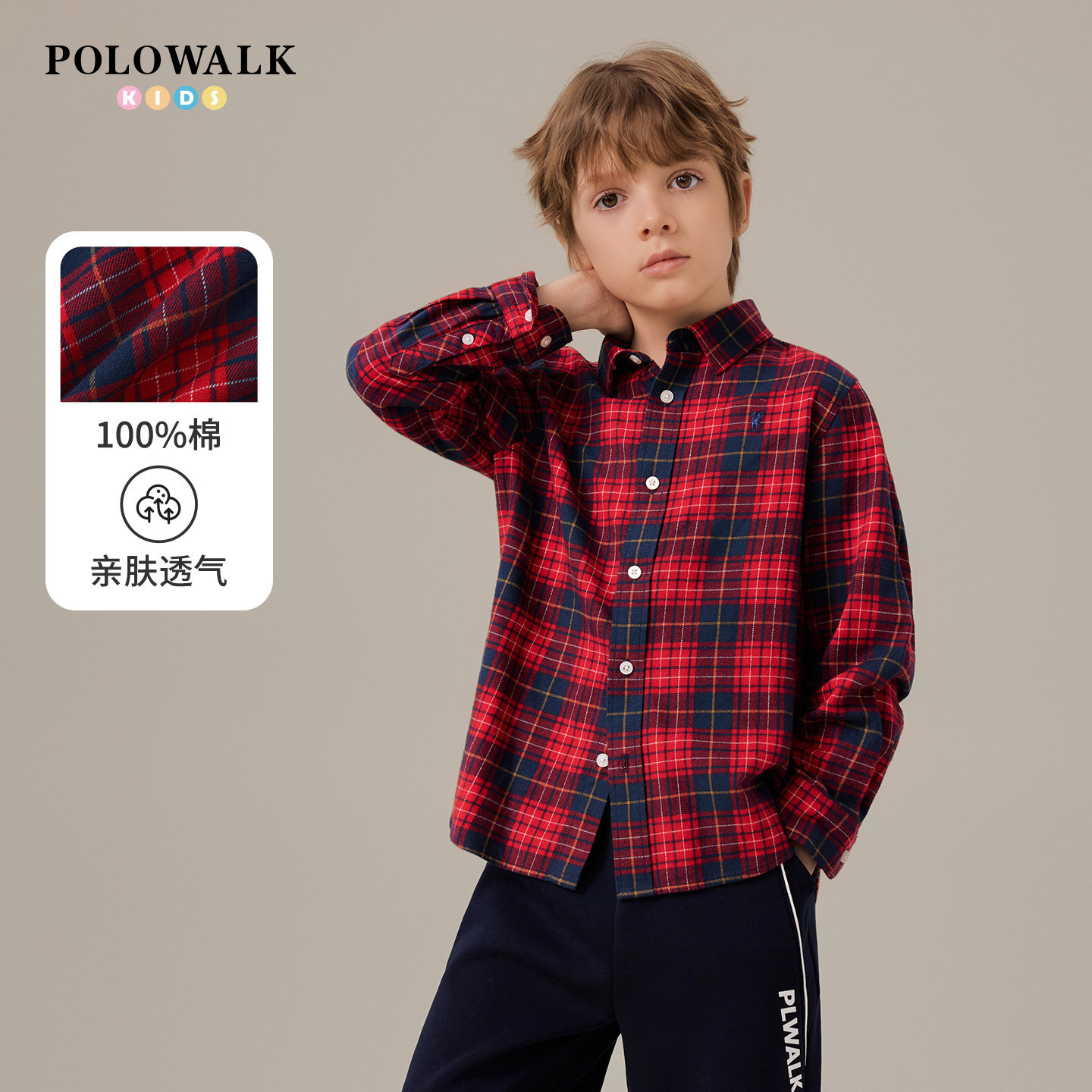 【100%棉】POLOWALK童装男童长袖衬衫磨毛2025秋冬格子长袖外套