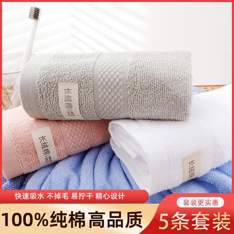 5条纯棉100%洗脸毛巾家用男全棉女柔软面巾不易酒店洗澡长绒棉