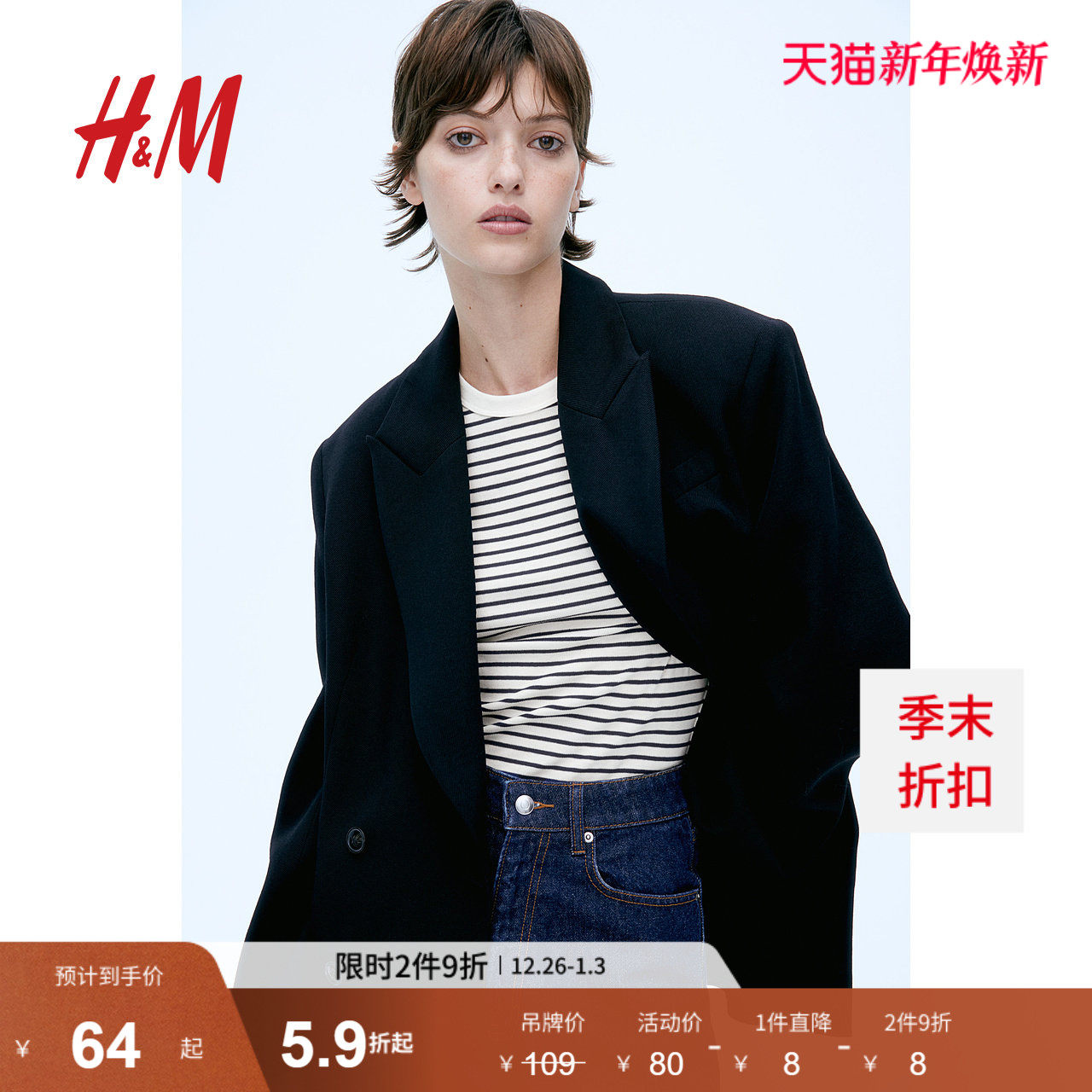 HM女装T恤冬季简约罗纹条纹修身圆领长袖柔软上衣1203084