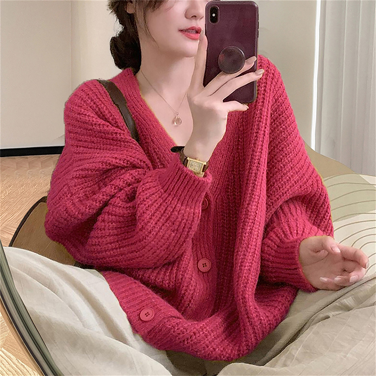加厚版!慵懒风撞色单排扣毛衣开衫女冬季新款韩版宽松针织外套潮