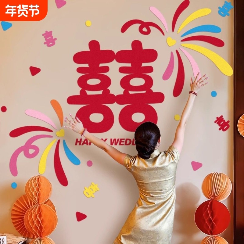多巴胺婚房布置装饰卧室床头沙发楼梯女方背景墙结婚喜字墙面窗户