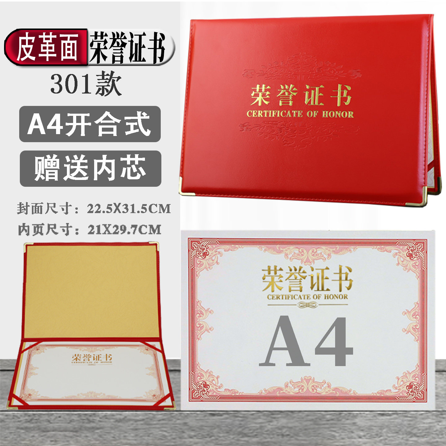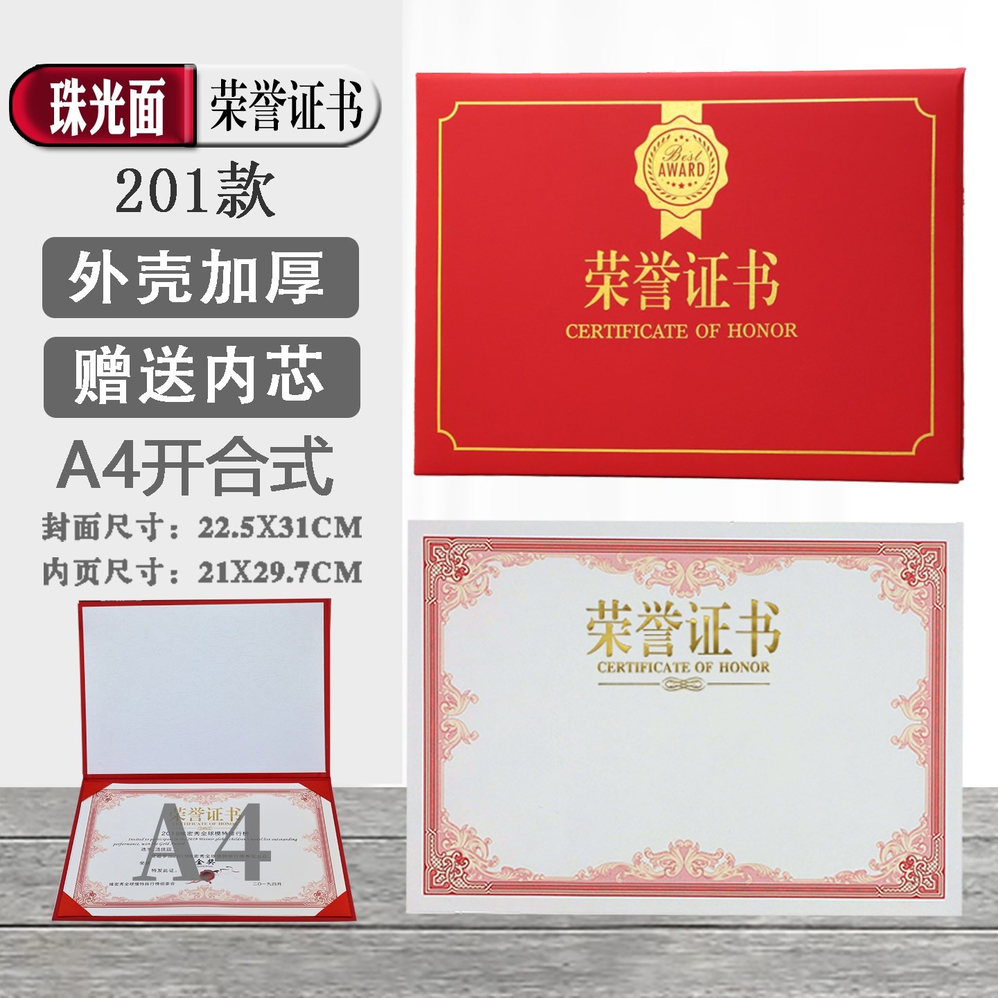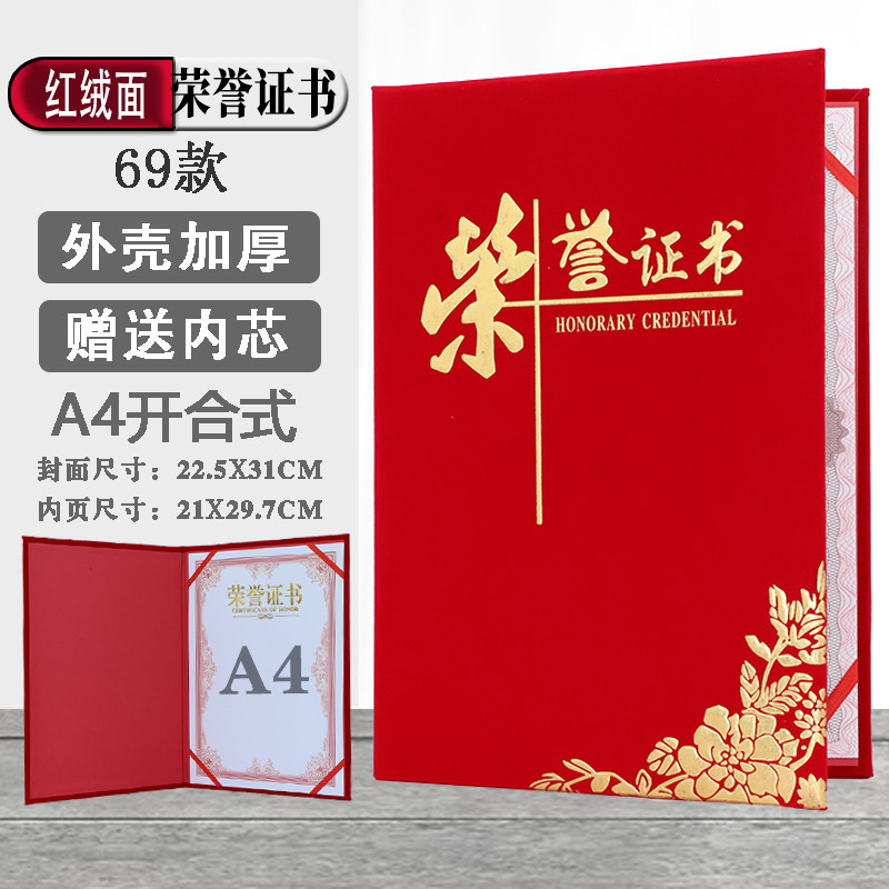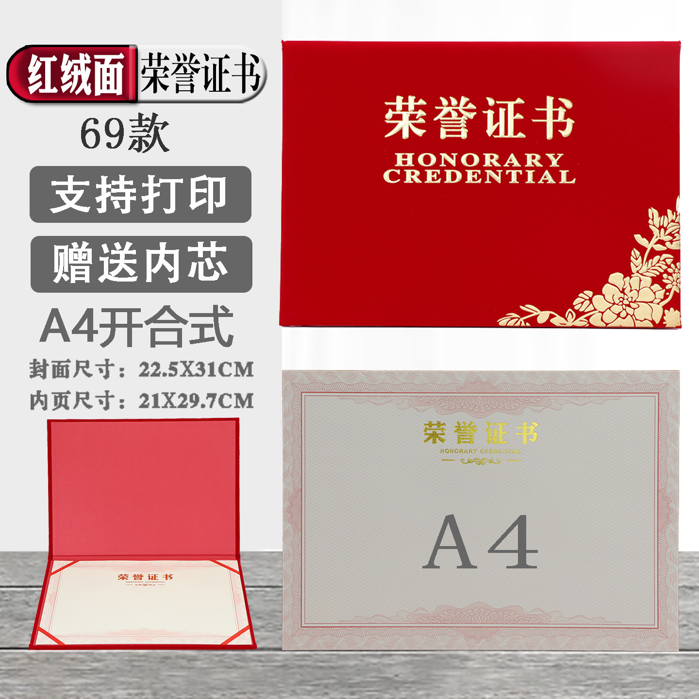 高档大气A4红绒面荣誉证书 赠送内芯 可打印