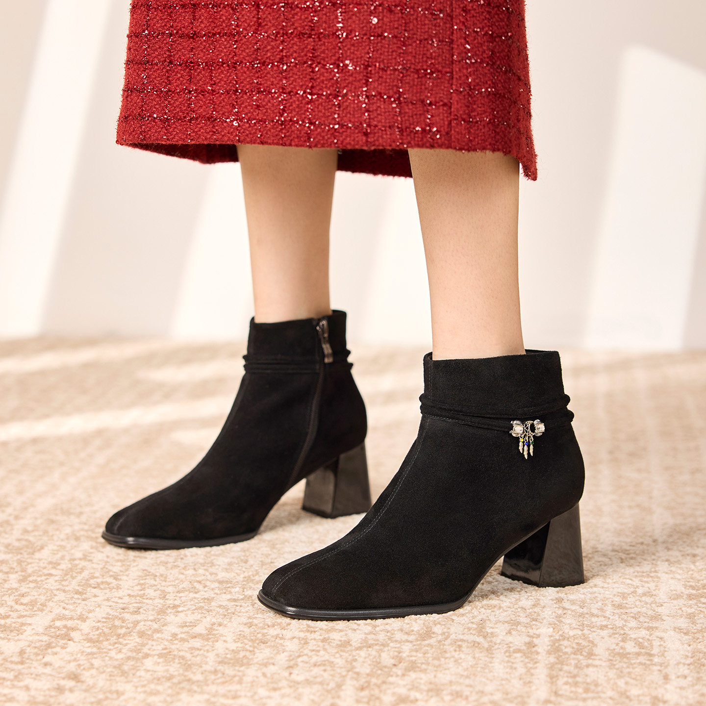 奥康 女鞋2025冬季时装靴显瘦时装靴粗高跟加绒低筒短靴门店发货