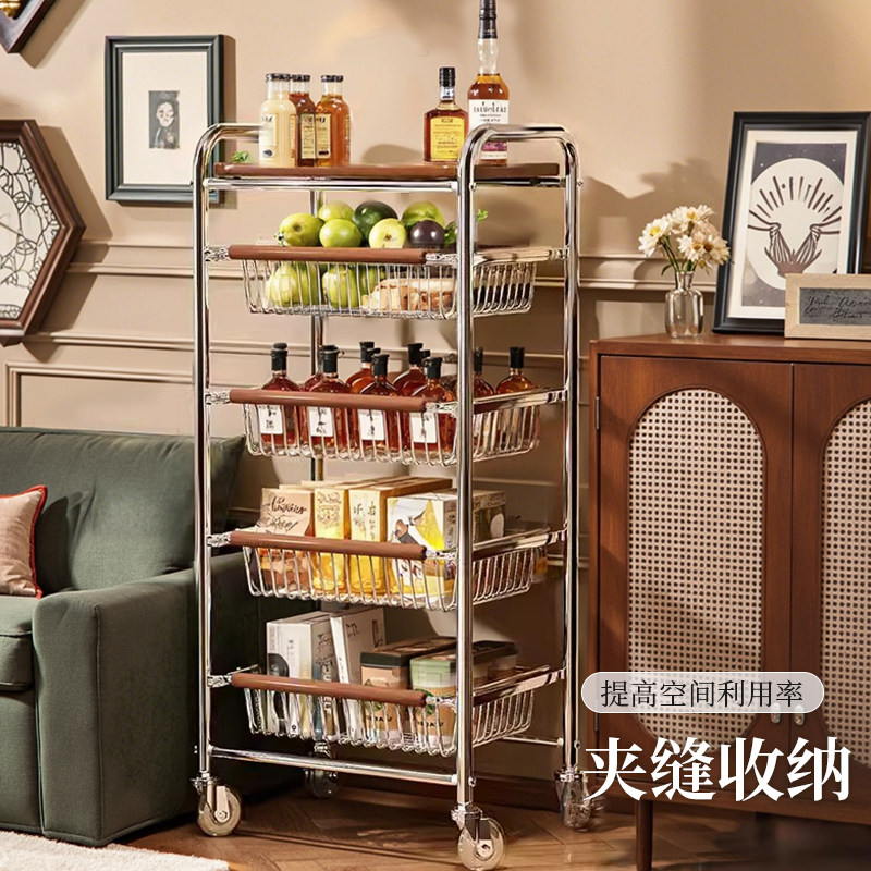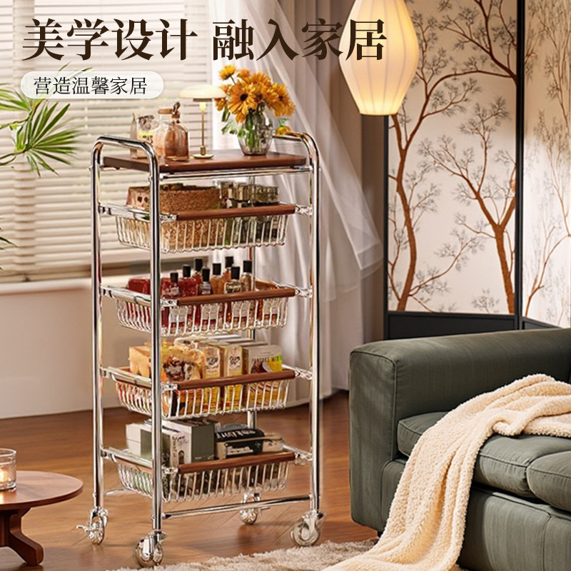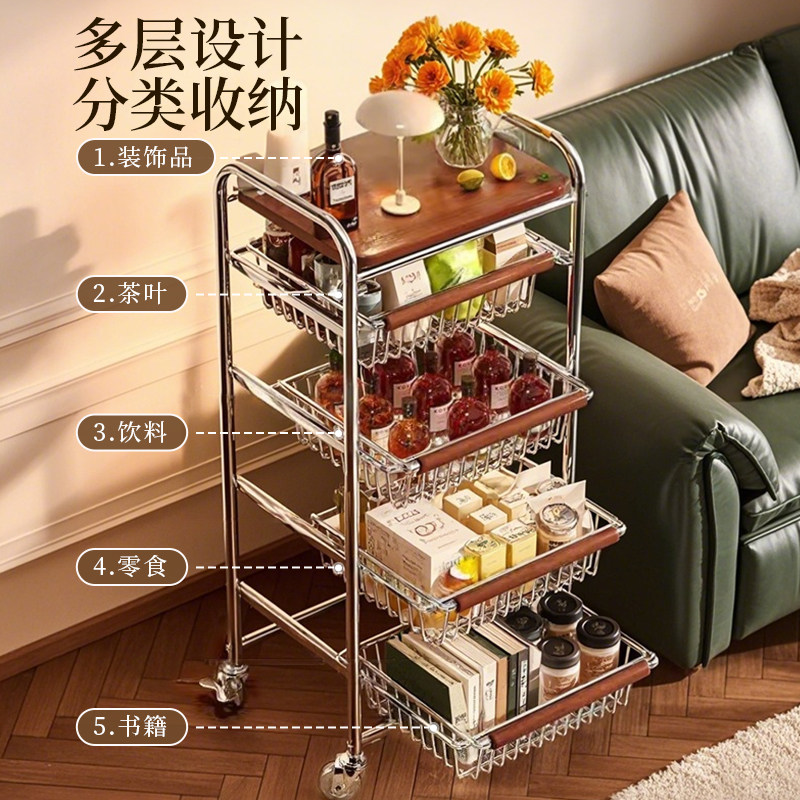 北欧可移动推车不锈钢家用收纳小推车ins风原木色沙发边几置物架