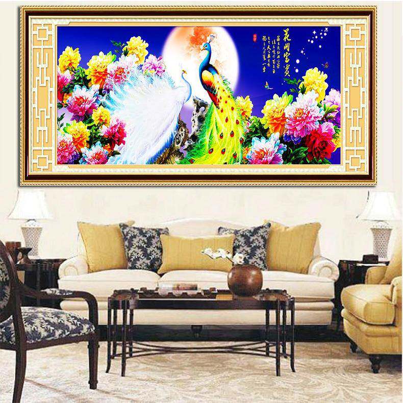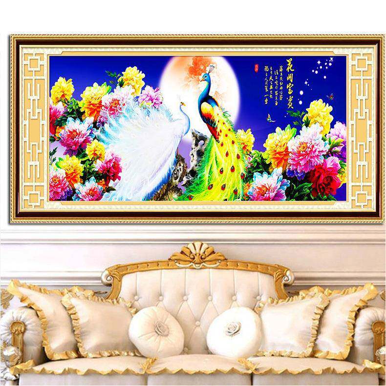 青飞花好月圆花开富贵十字绣孔雀开屏牡丹十字绣孔雀图客厅