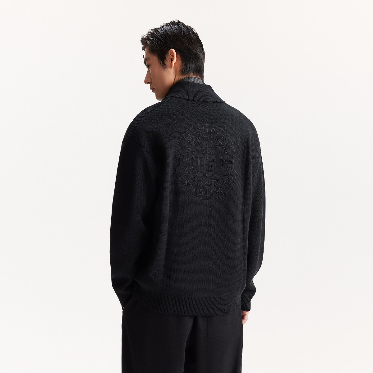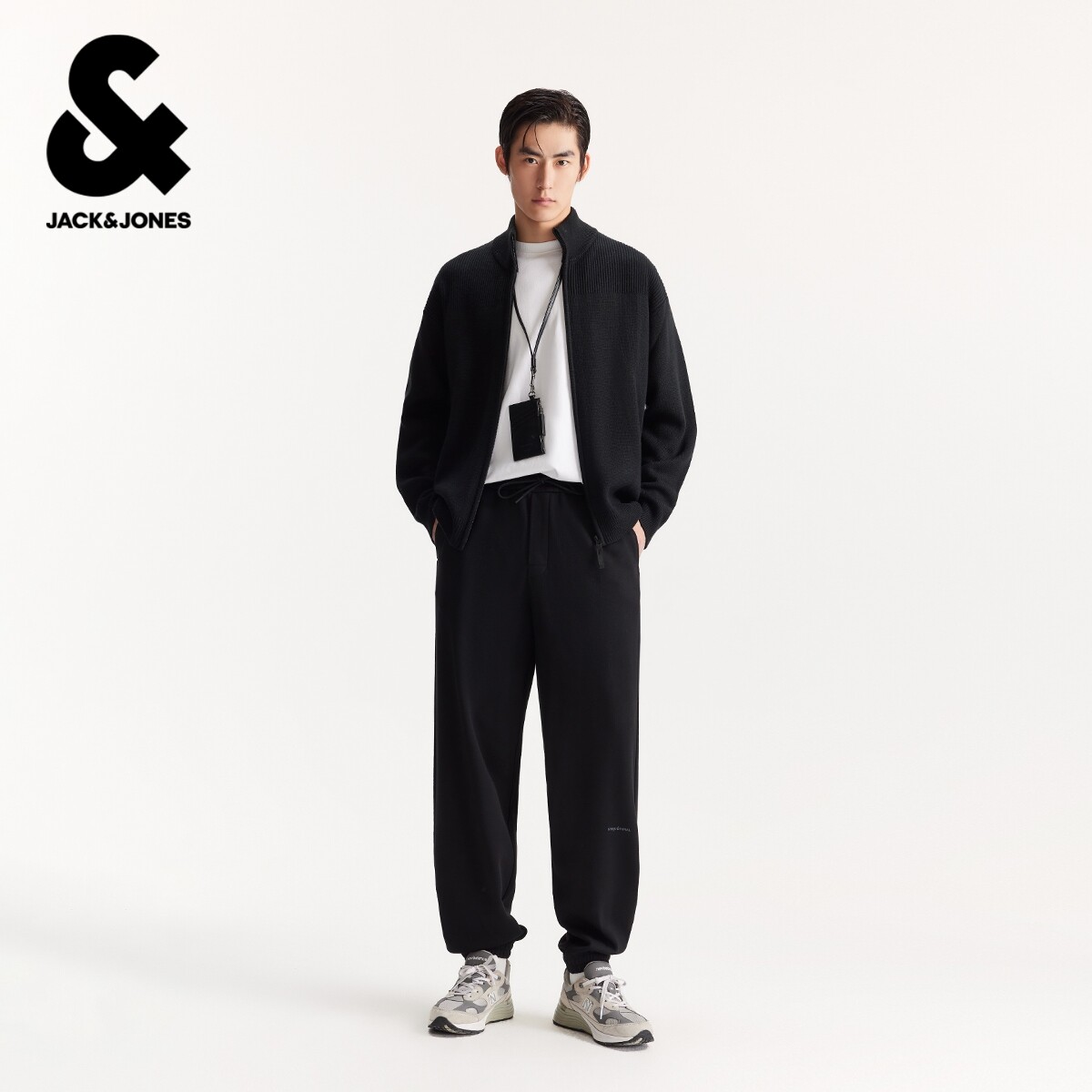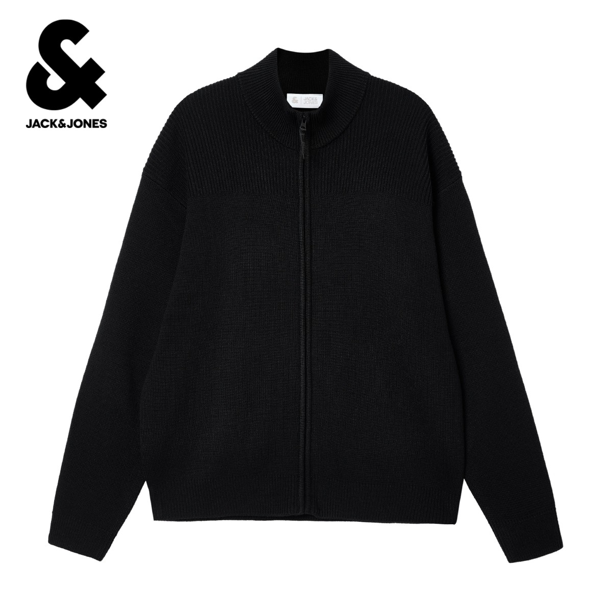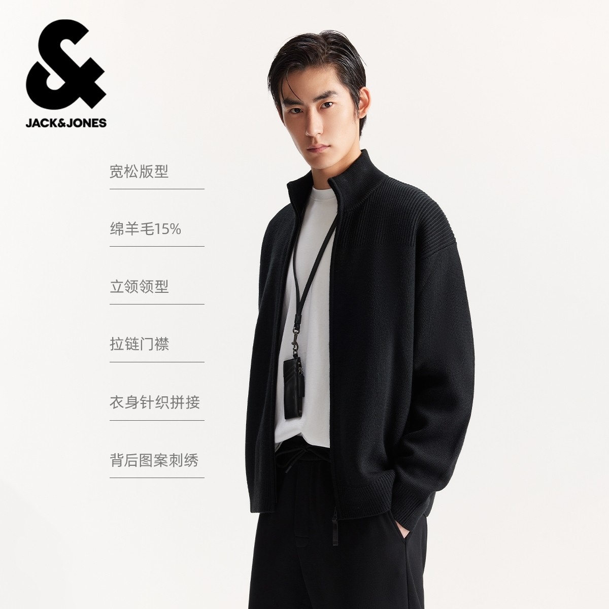 杰克琼斯男装毛针织衫春秋字母刺绣图案拼接宽松立领开衫外套上衣