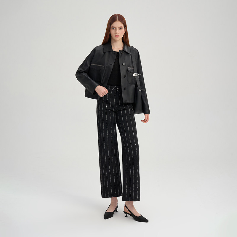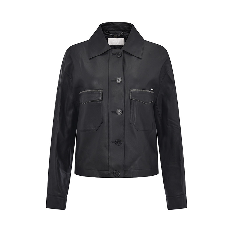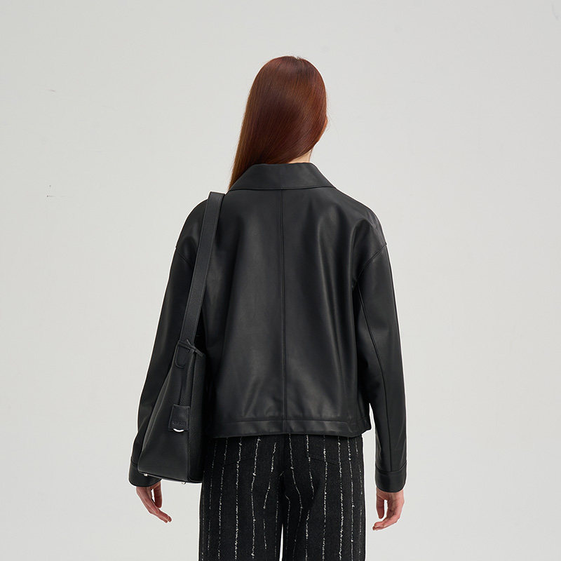 RARE威雅女装 2025秋季新款微落肩短款黑色皮衣女士羊皮夹克外套