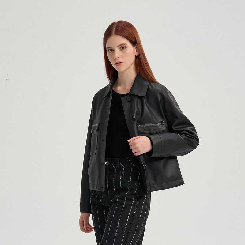 Eland衣恋皮衣女纯色带拉链长袖翻领外套2025冬季新款