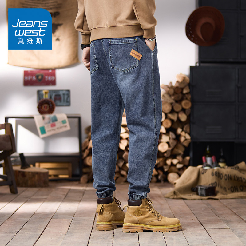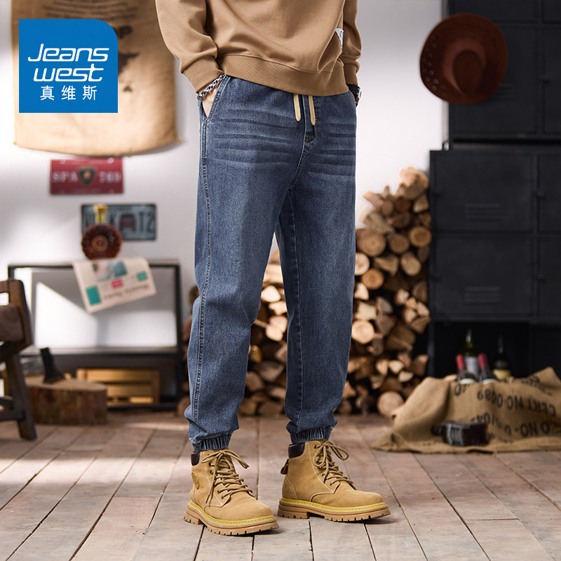 KZ真维斯宽松紧腰抽绳牛仔裤男士复古潮牌男裤子春秋季2025年新款