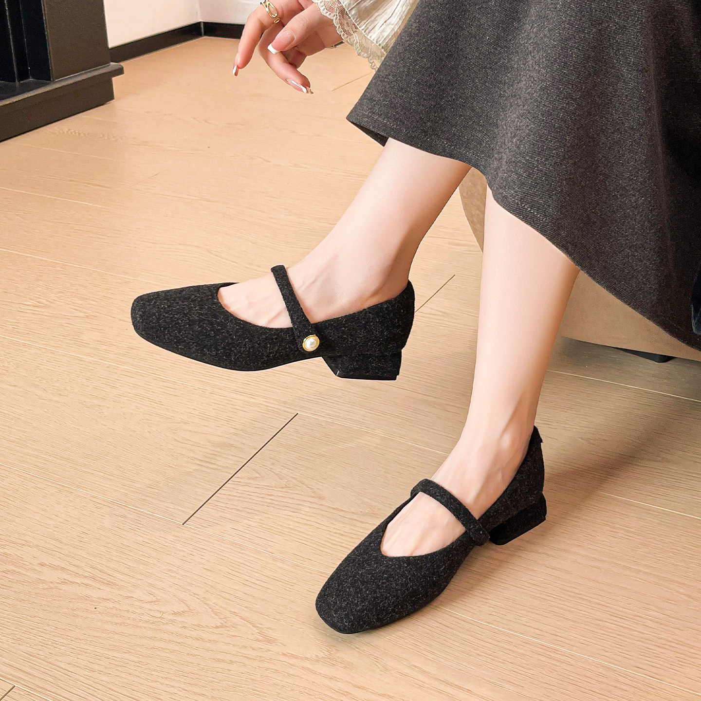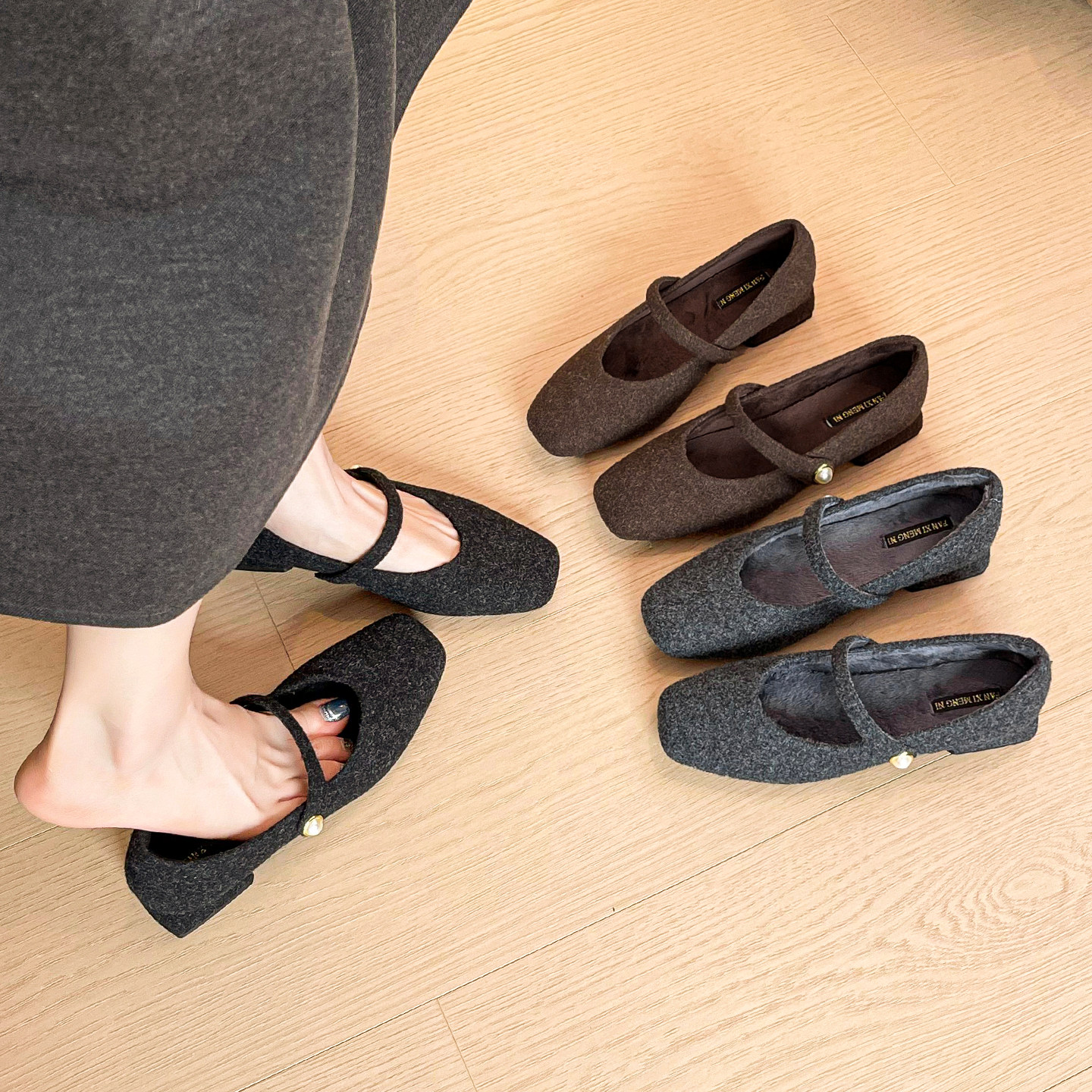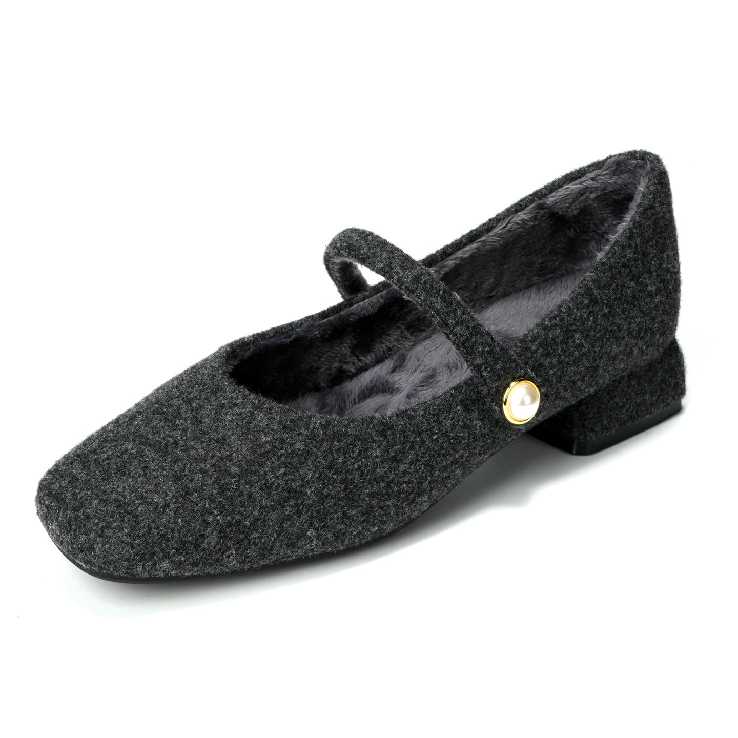羊皮版复古玛丽珍鞋女方头秋冬季加绒保暖毛毛棉鞋平底晚晚单鞋女