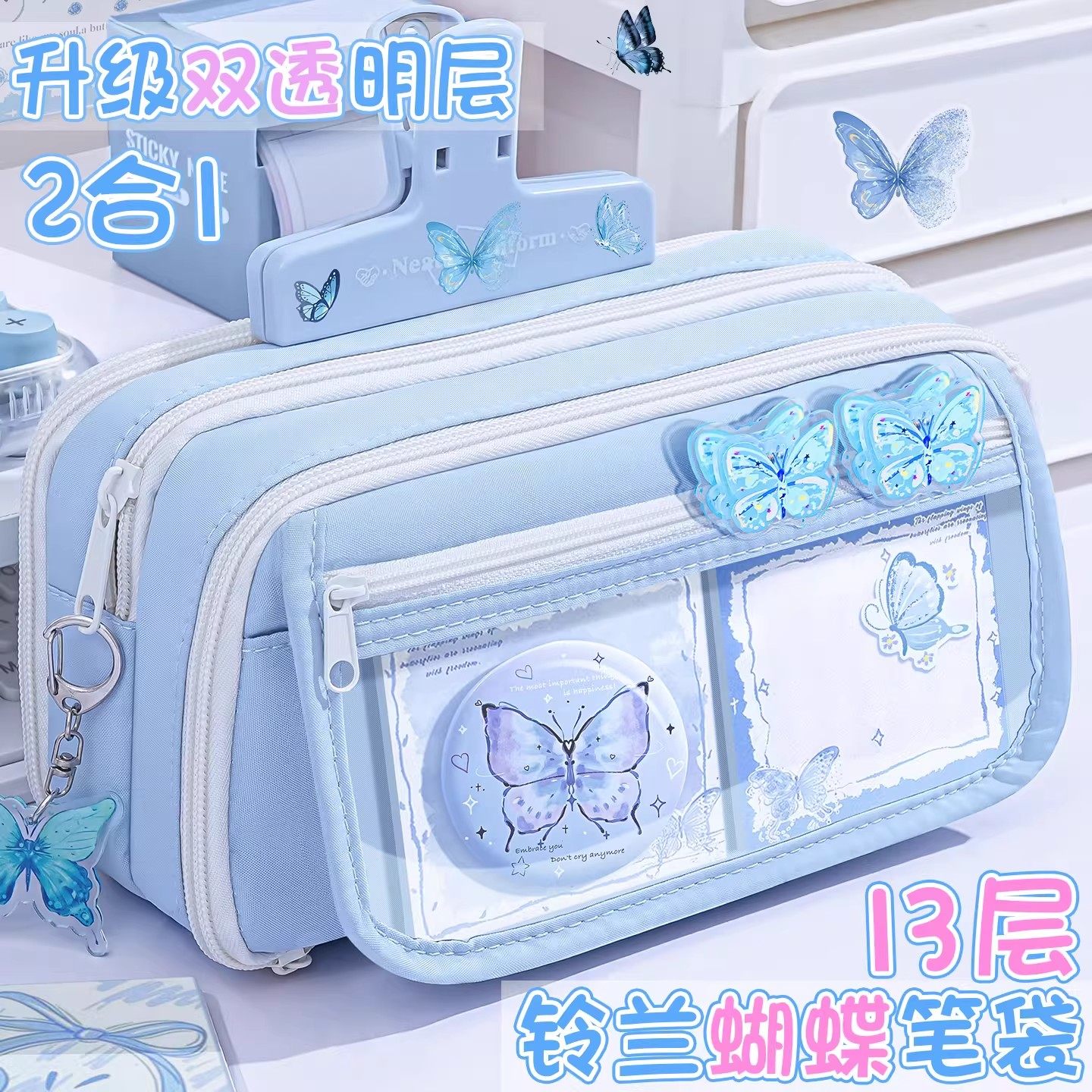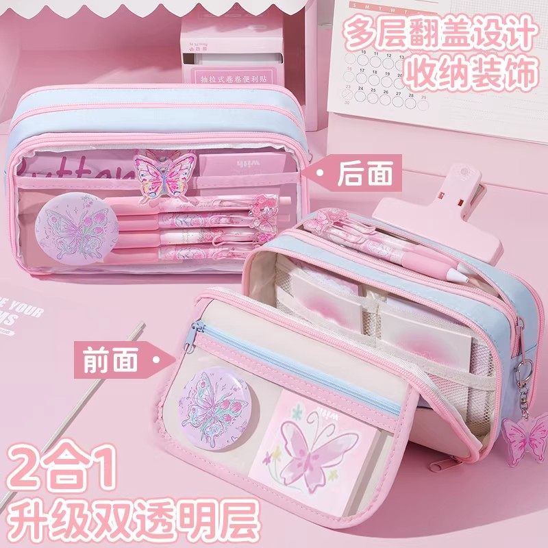 铃兰蝴蝶一套配齐~13层大容量笔袋女生2026新款超火高颜值ins风文具盒女孩款小学生透明铅笔盒2026初中不撞款