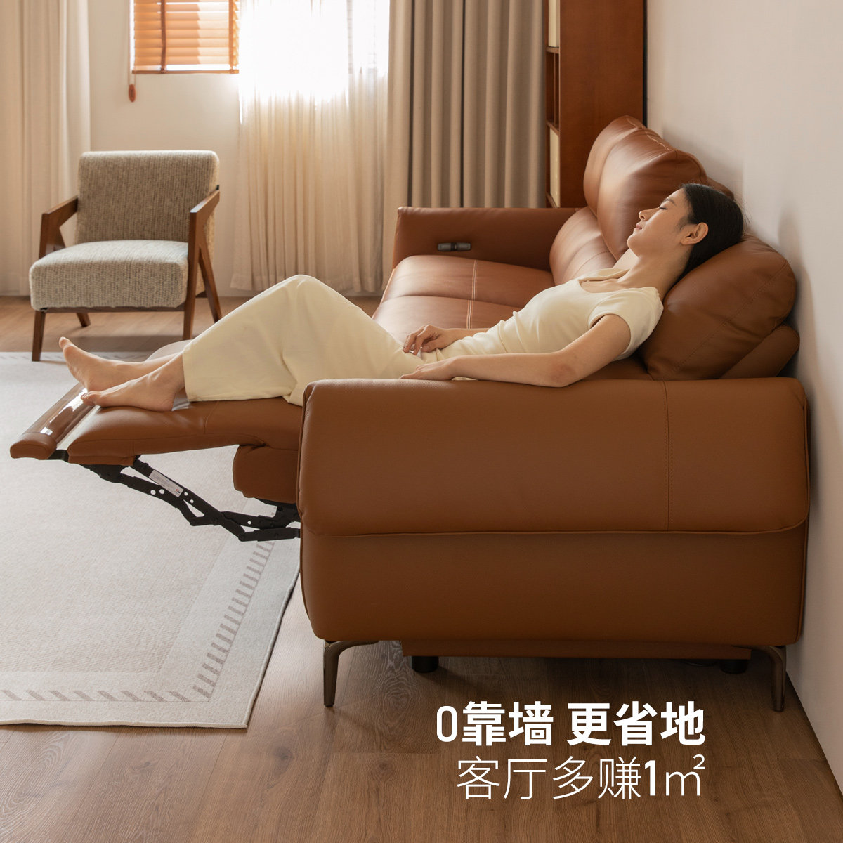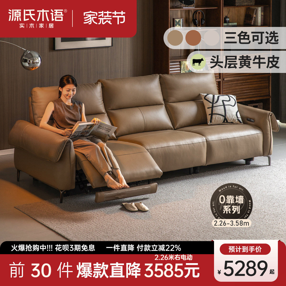 源氏木语零靠墙真皮沙发现代简约头层牛皮沙发客厅伸缩电动沙发