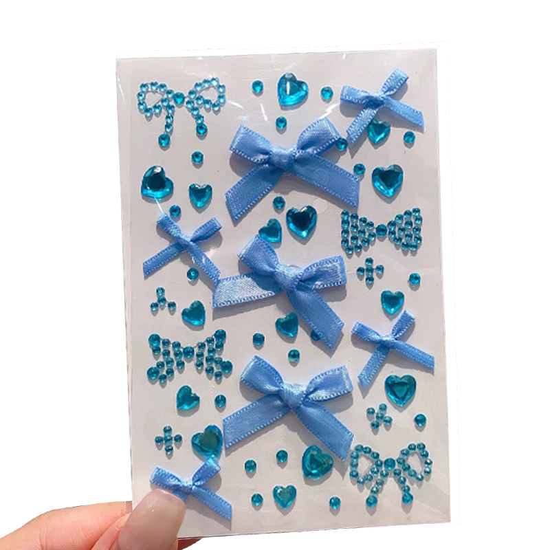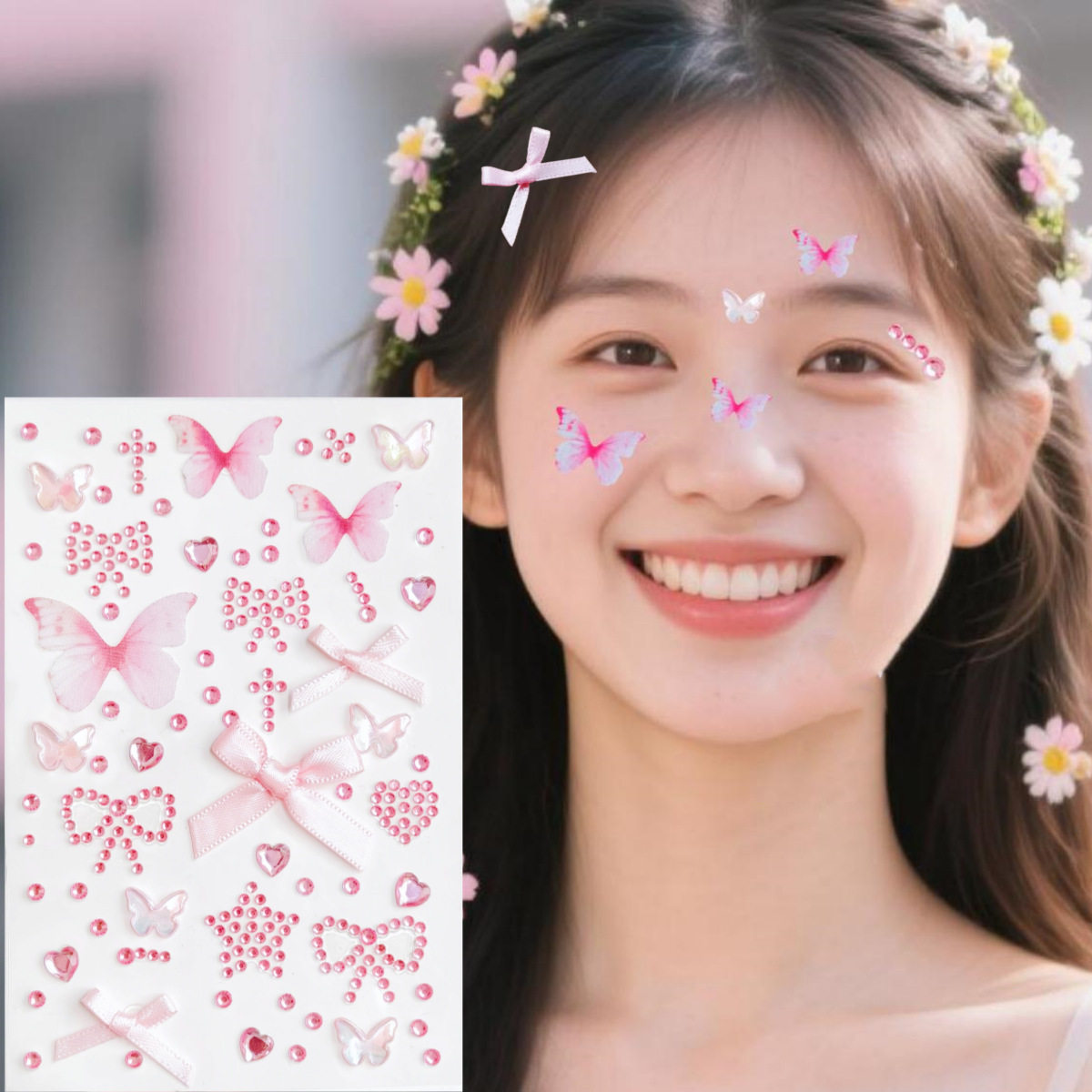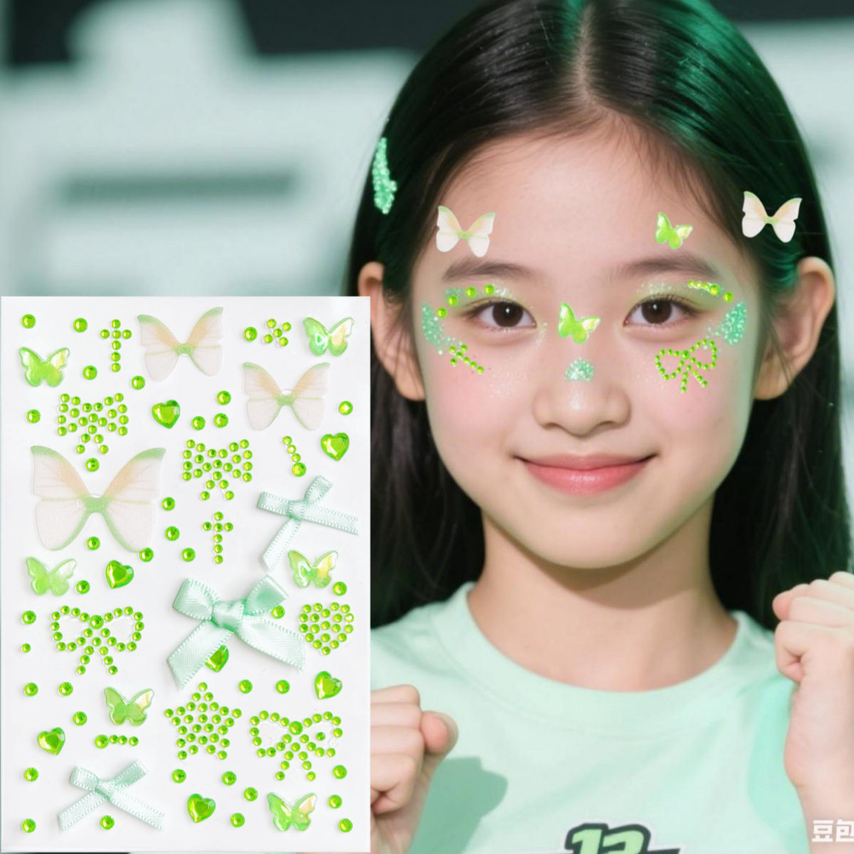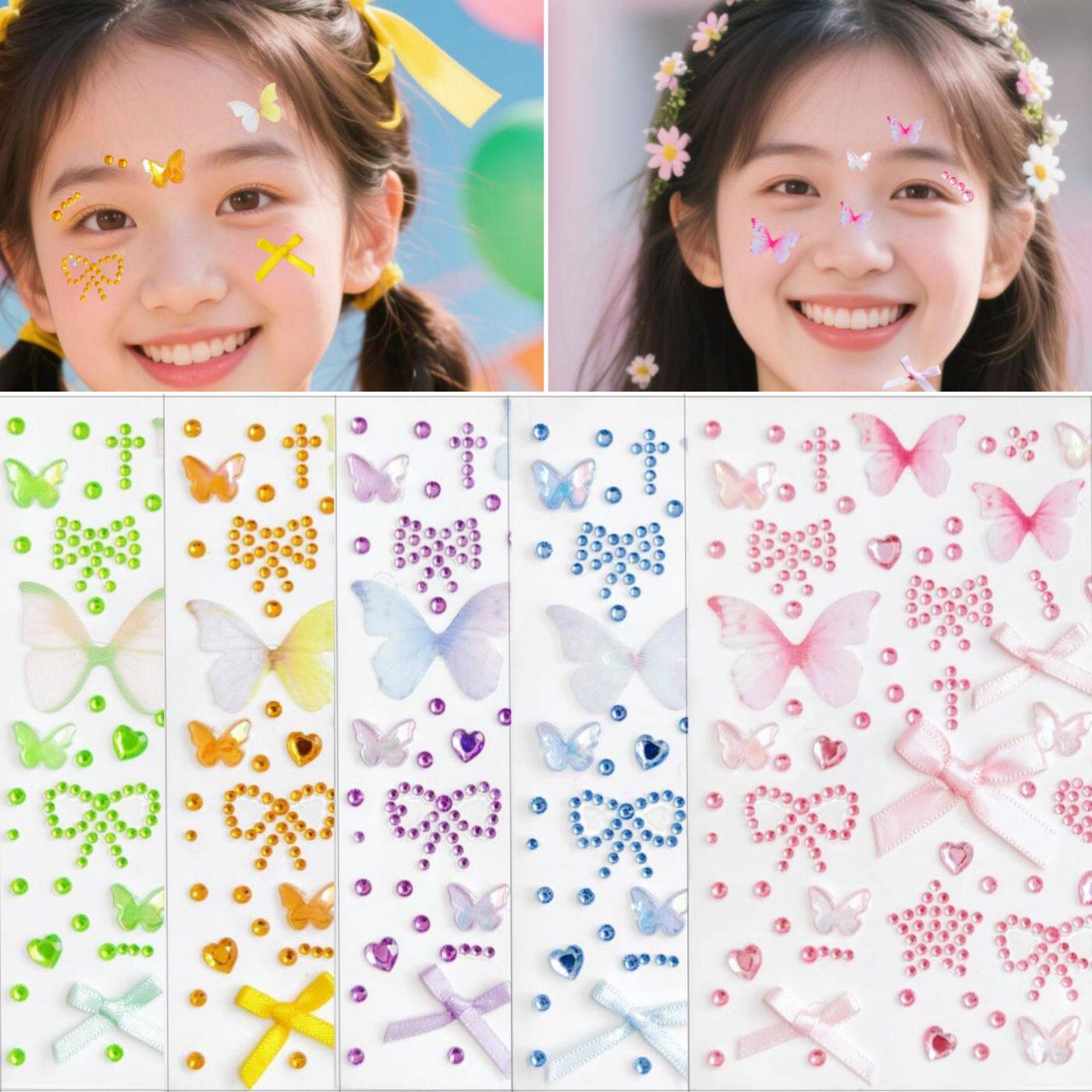 儿童节日舞台表演立体装饰丝带蝴蝶结贴自粘贴薄纱蝴蝶闪亮水钻脸贴演唱会派对追星妆容贴女孩拍照化妆饰品贴