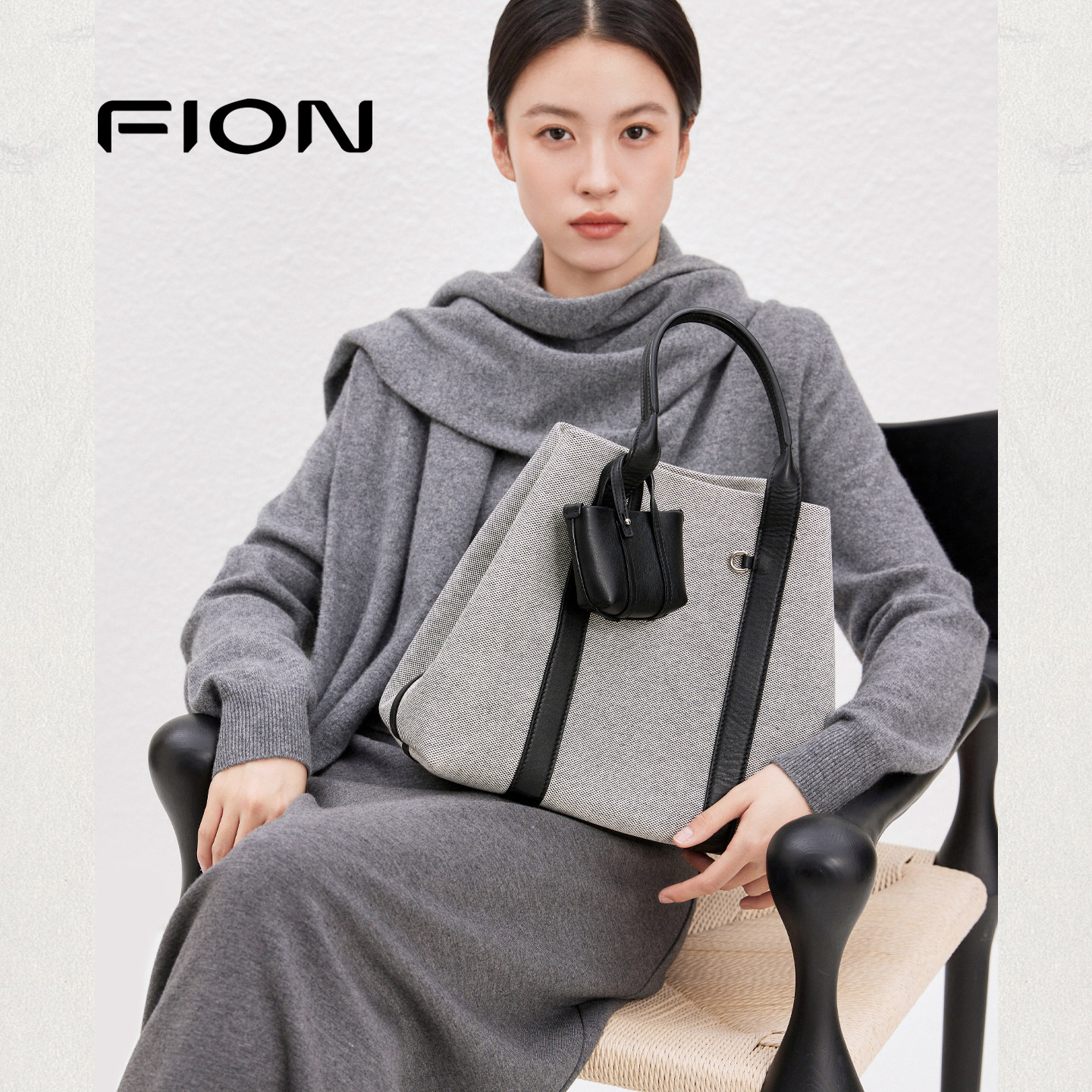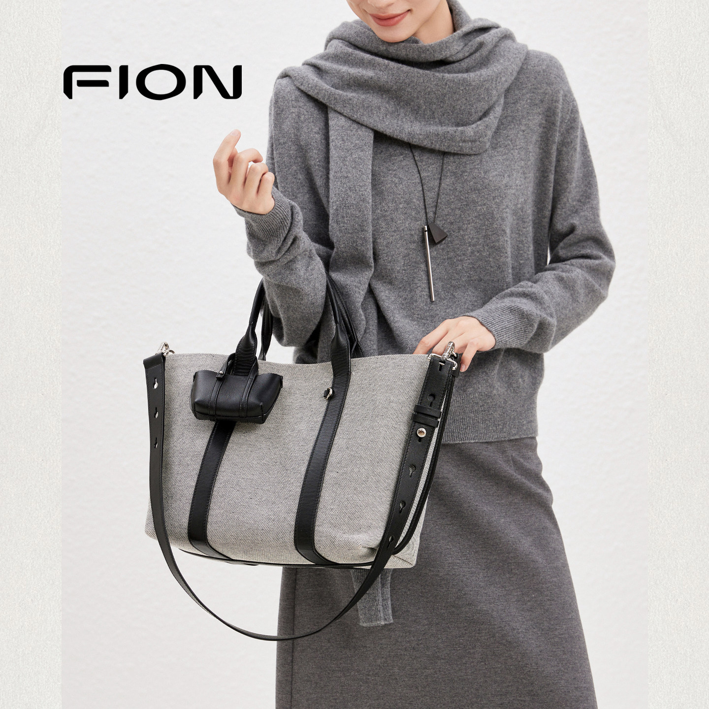 Fion/菲安妮女包新款帆布托特包真皮小篮子通勤单肩斜挎手提包包