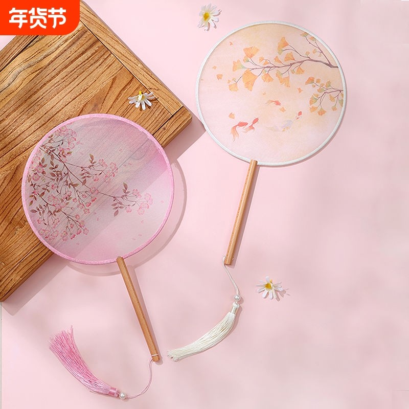 团扇双面古典扇子古风半透圆形流苏女古装汉服旗袍丝质古装扇子