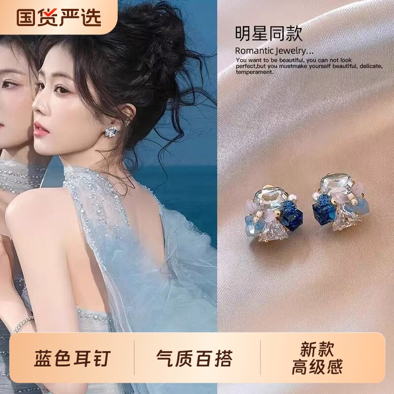 蓝色耳钉女方圆脸2025新款爆款轻奢高级感气质大气耳环巨好看耳饰