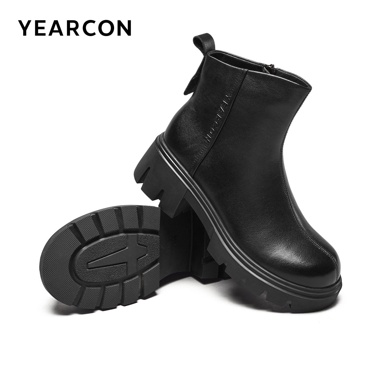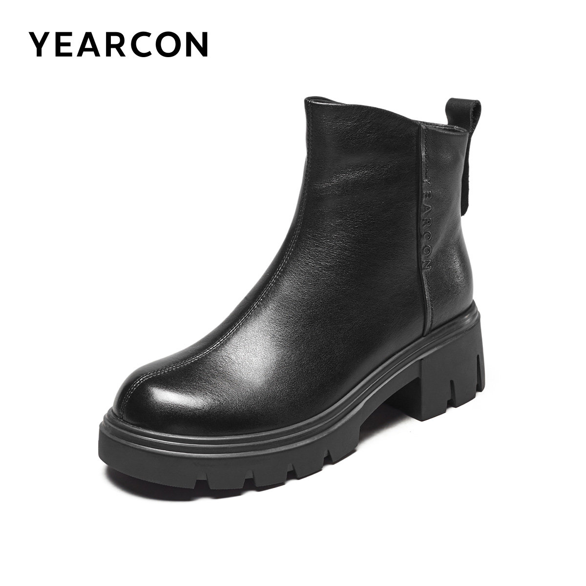 意尔康女鞋2025冬季真皮法式加绒保暖短靴粗跟气质及踝靴女士皮鞋