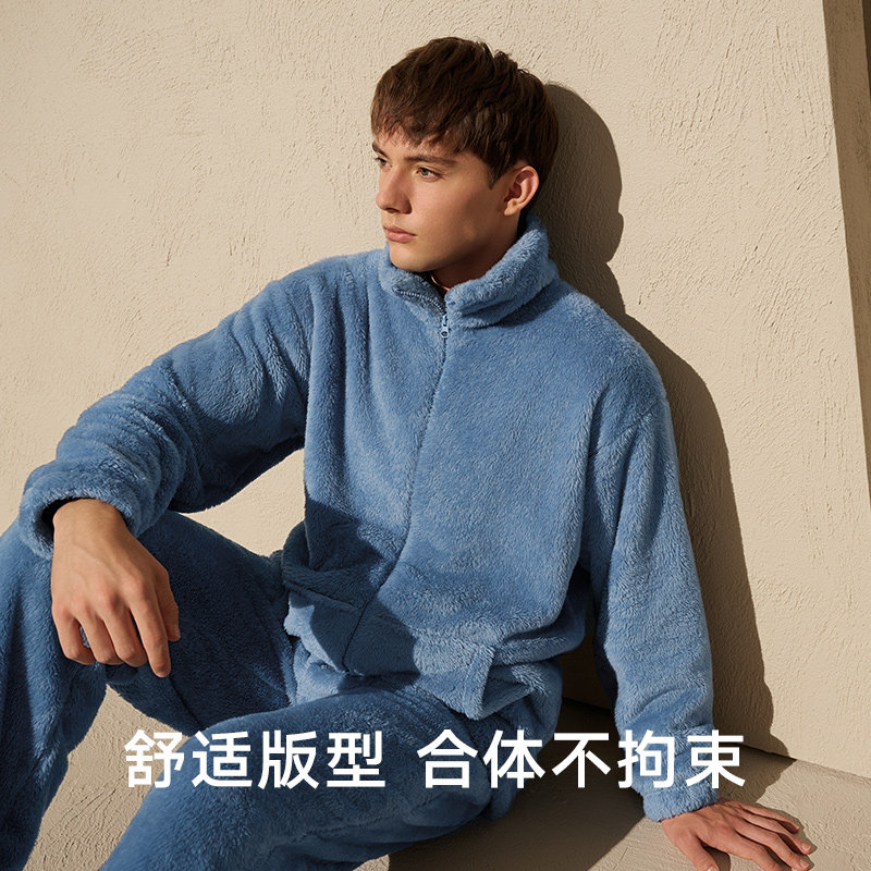 曼妮芬24秋冬加厚男士立领开襟长袖长裤套装舒适家居服合体起居服