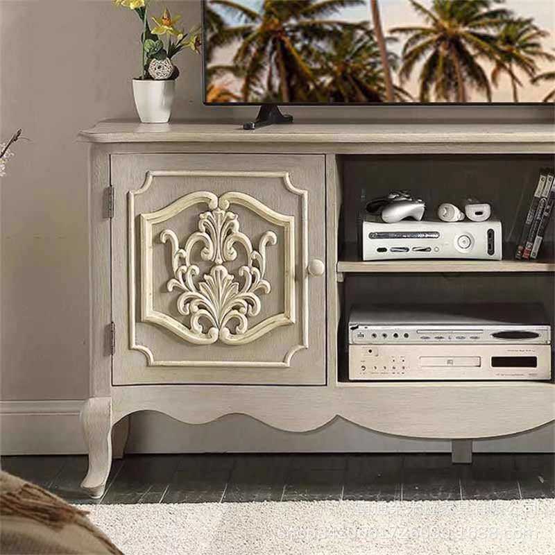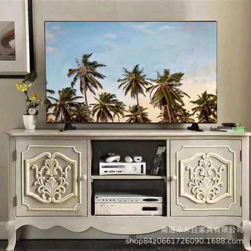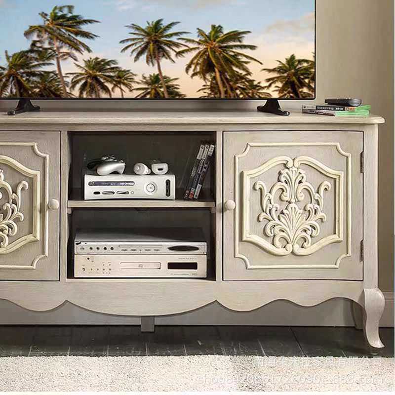 美式乡村实木白色雕花电视柜高端别墅复古做旧客厅收纳 柜