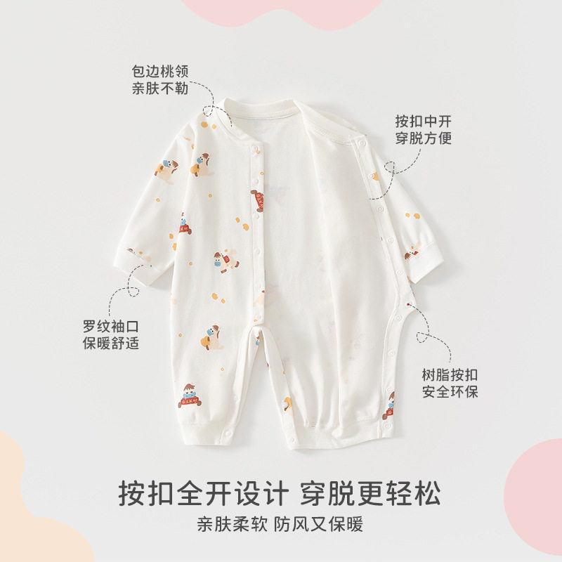 小猪大卫新生儿秋季保暖连体衣男女宝宝卡通印花中开夹棉爬服