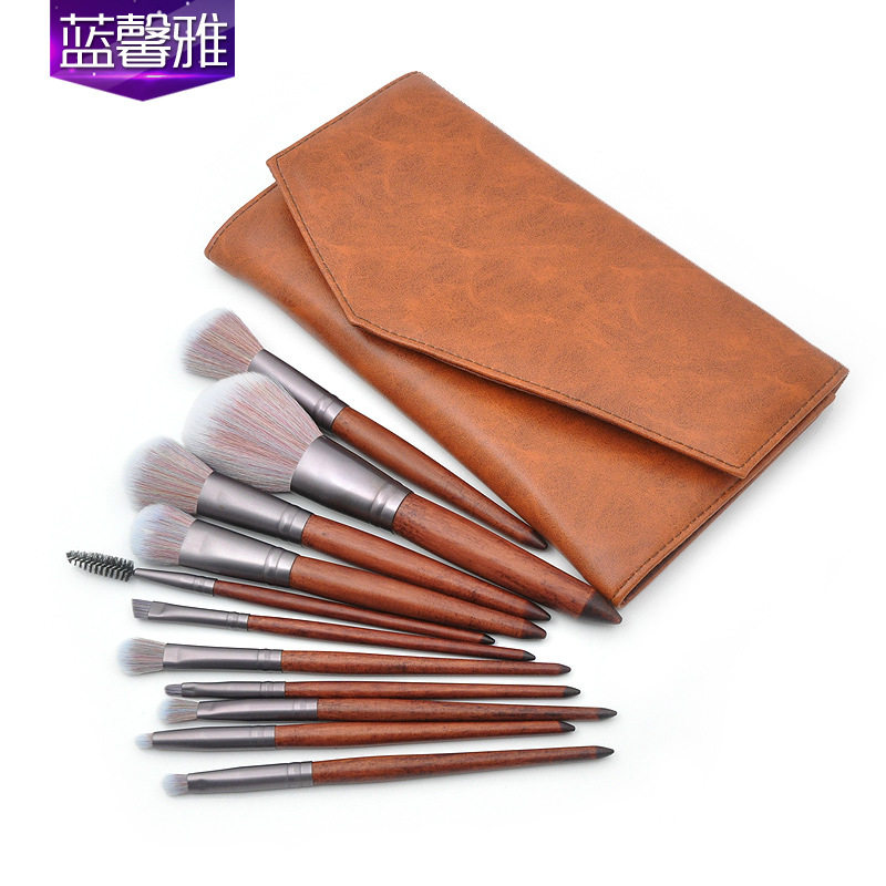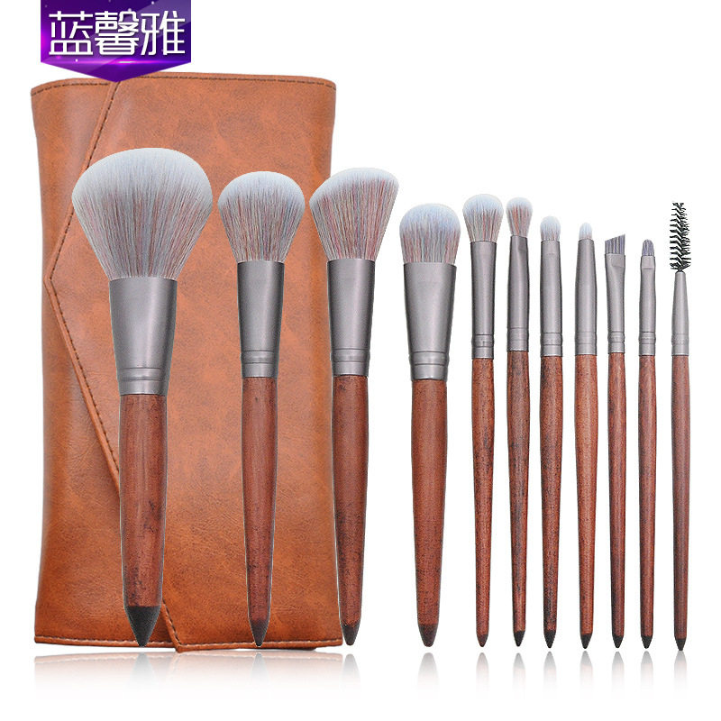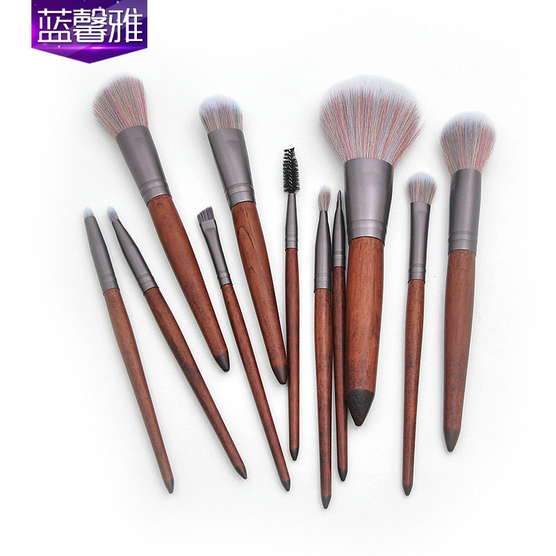 新款 11支木柄化妆刷套装 仿红木檀木色眼部刷3D混毛美妆彩妆工厂