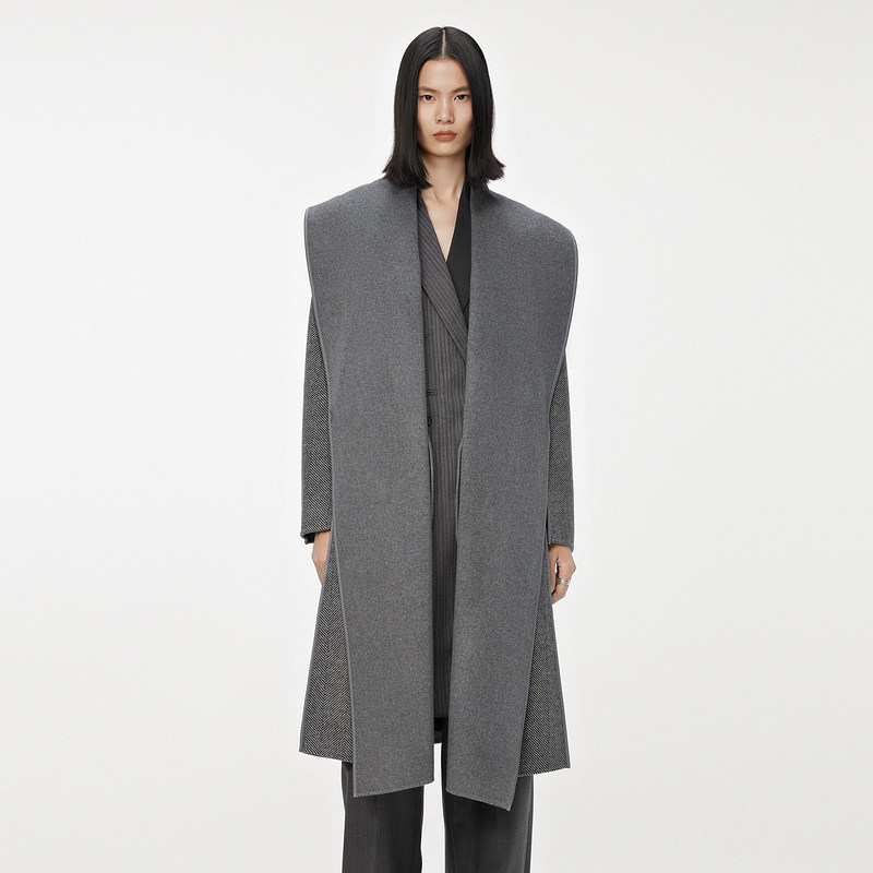 RUISHI芮时重磅驼绒桑蚕丝羊毛慵懒两穿领灰色毛呢大衣秋冬外套女
