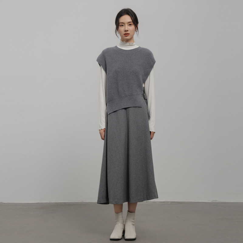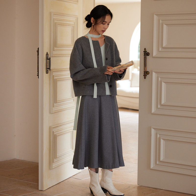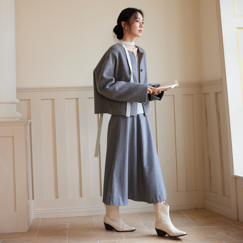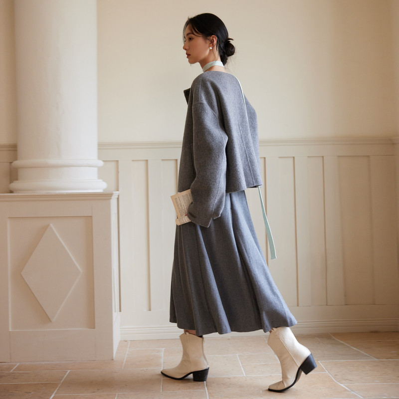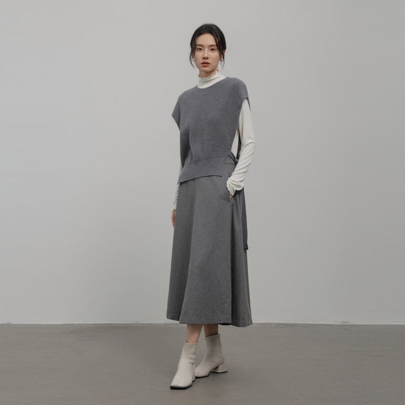 MJ STYLE灰色百褶西装裙女秋冬半身裙高腰休闲大摆a字过膝中长裙