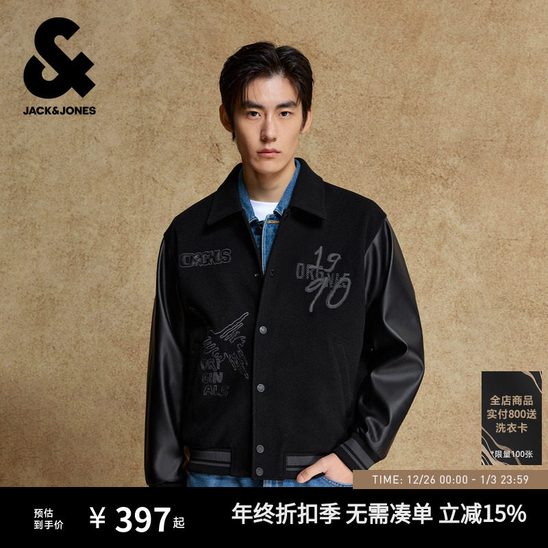 杰克琼斯夹克男秋季新款仿毛呢PU拼接外套宽松休闲棒球服上衣男装