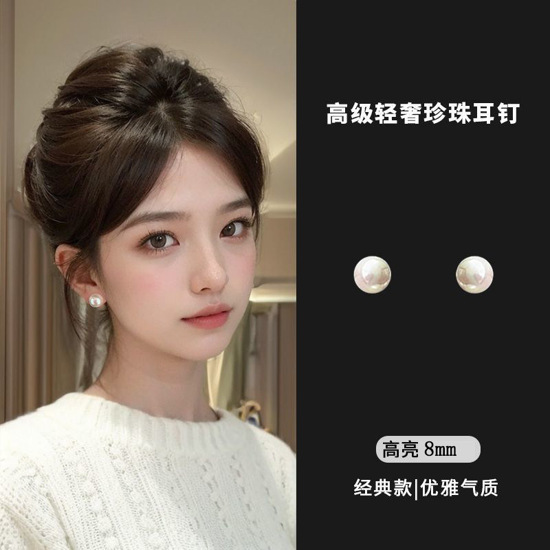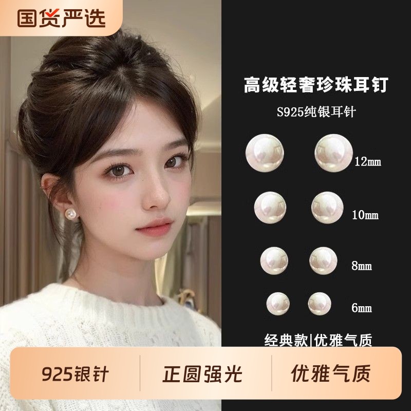 S925银针正圆澳白色人造珍珠耳钉女高级耳饰气质简约新款纯银耳环