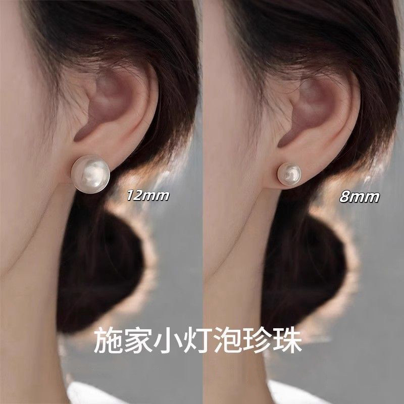 999纯银耳钉女施家珍珠馒头珠耳环扁圆高级气质法式复古轻奢耳饰