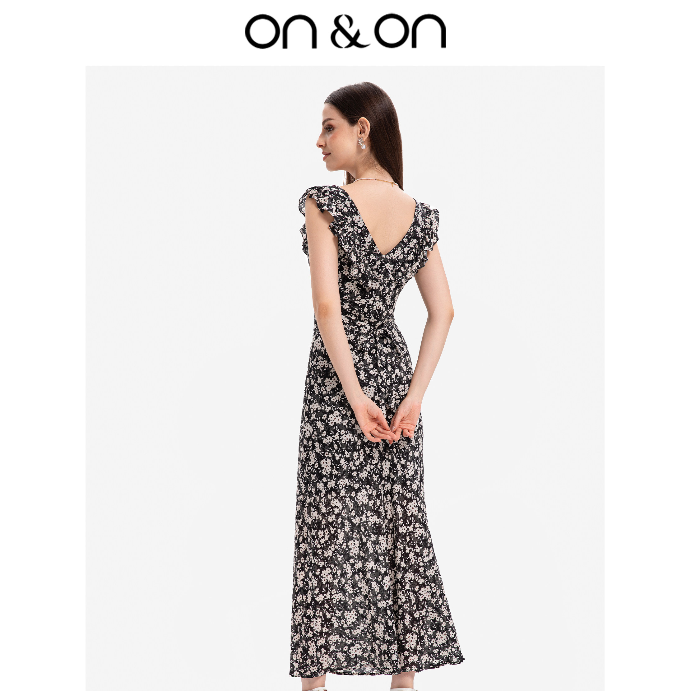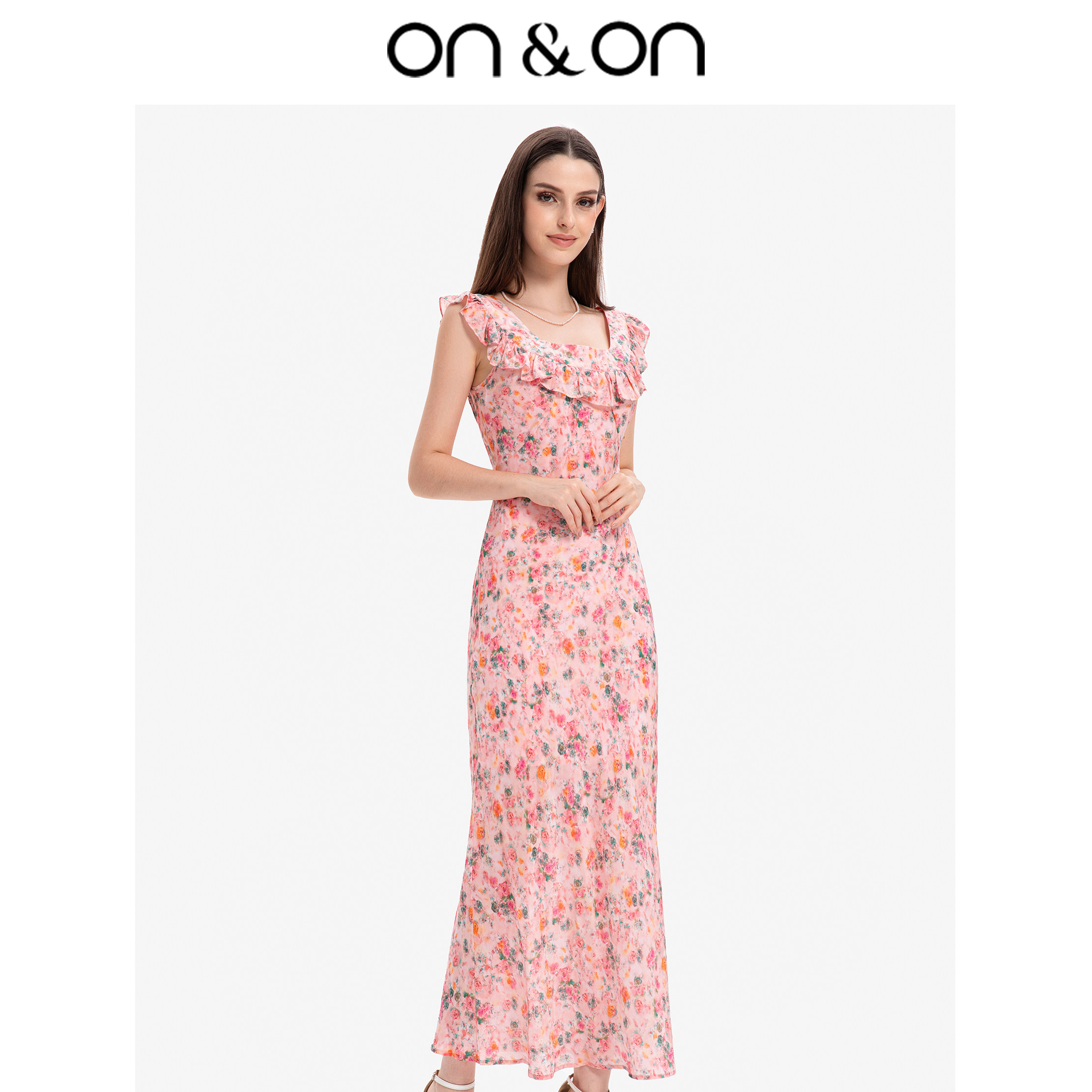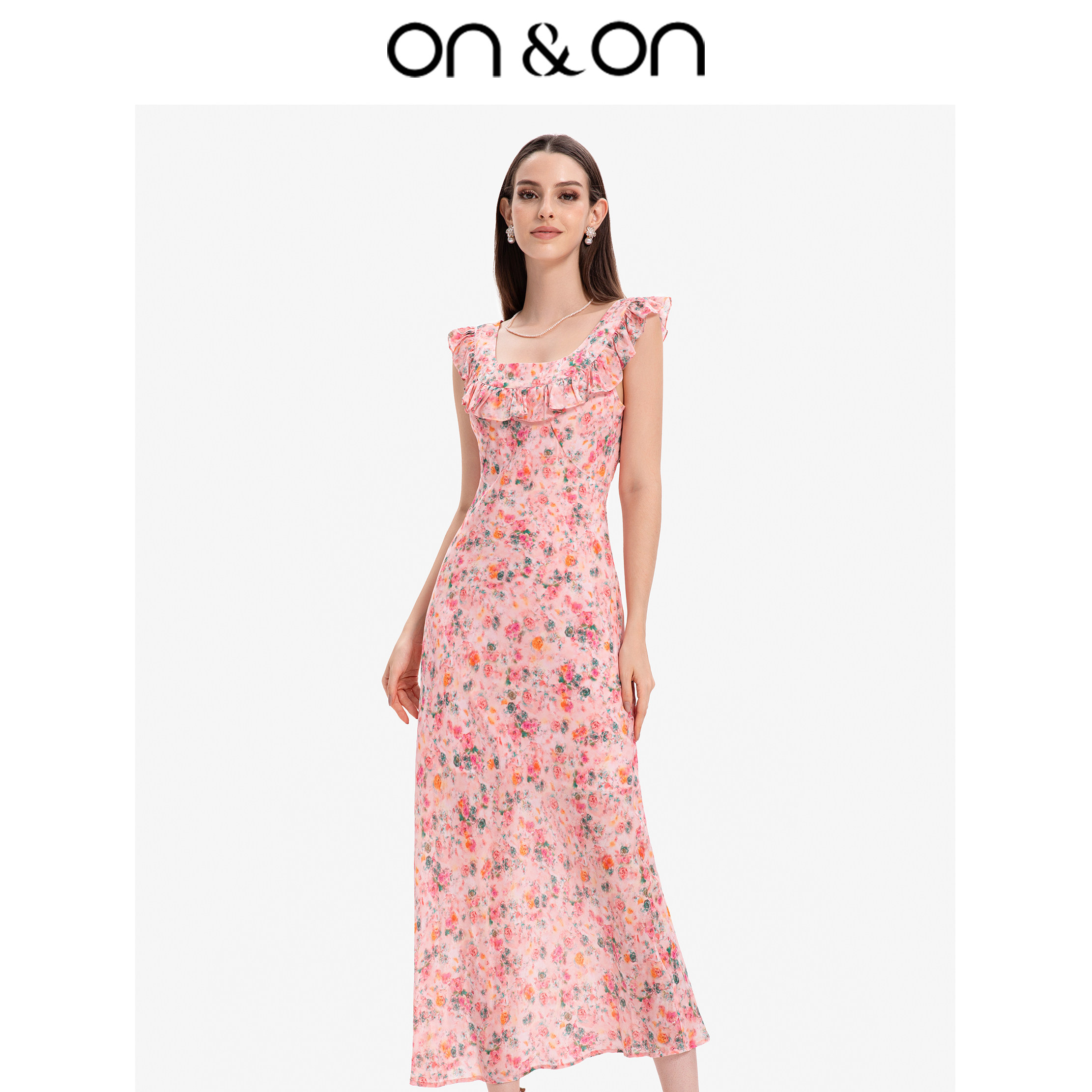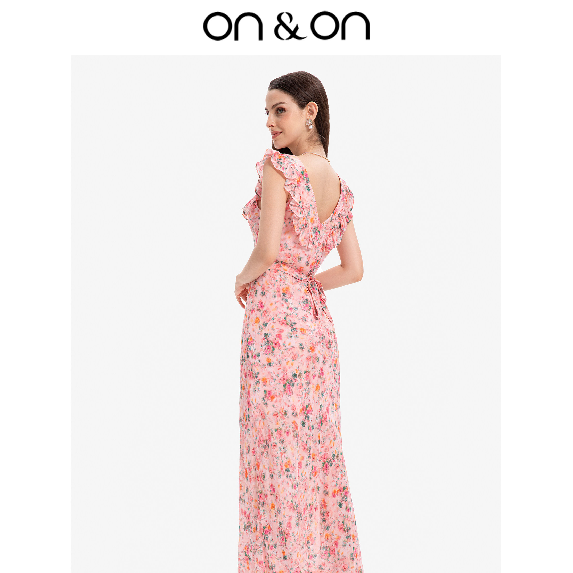 ON&ON/安乃安2025夏季新款V领荷叶边系带收腰100%桑蚕丝连衣裙女