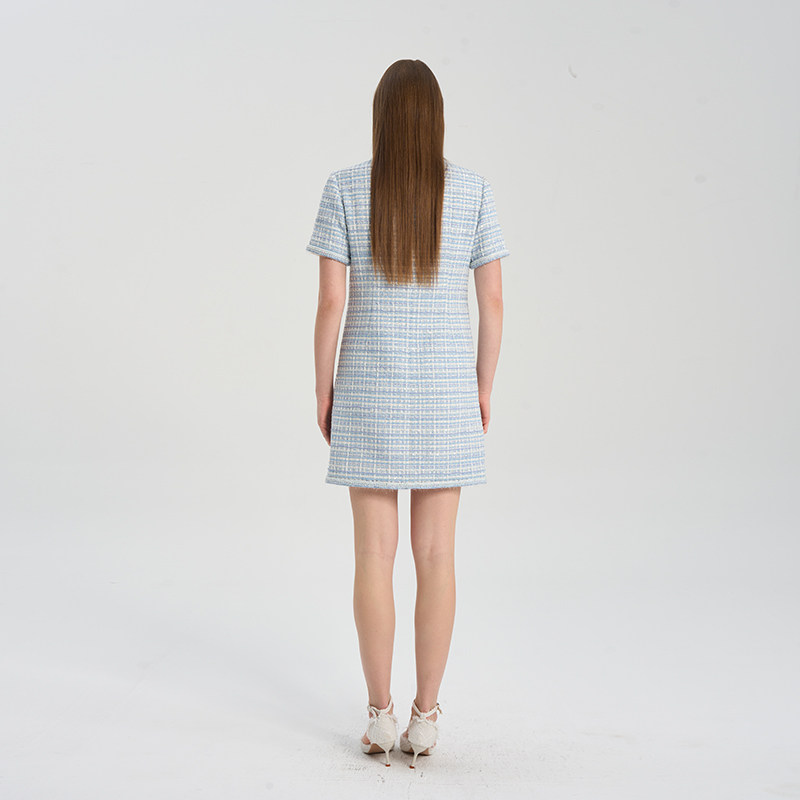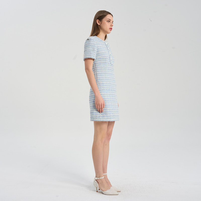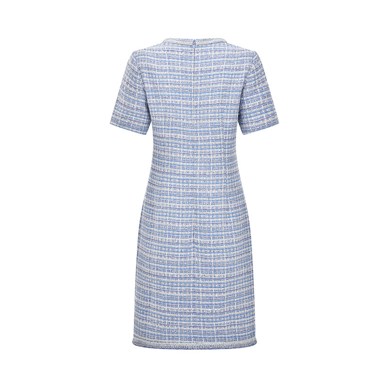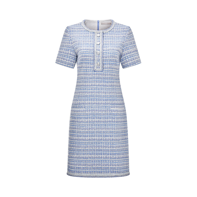RARE威雅女装春夏新款霁风蓝修身圆领短袖连衣裙RR22453108