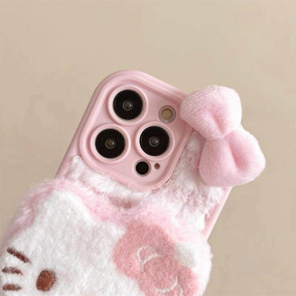 毛绒立体蝴蝶结KT猫适用苹果16pro手机壳秋冬iphone17promax格纹13秋冬14全包15硅胶12防摔8plus链条XR可爱女