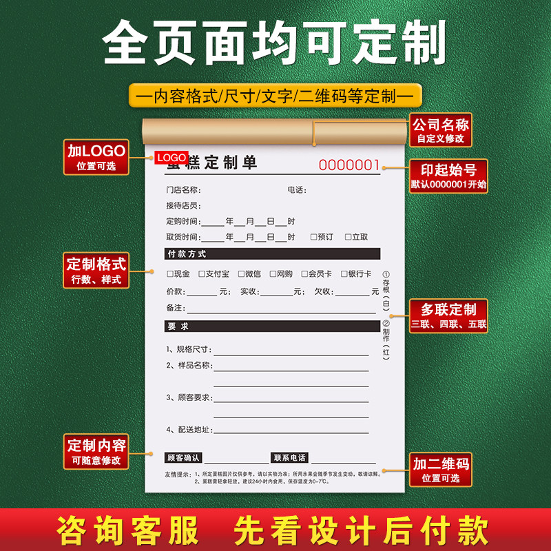 蛋糕订单本二联甜品店预订票据烘焙坊预定收据西饼屋糕点房订制单花店定购订货单三联定制单据生日蛋糕订购单