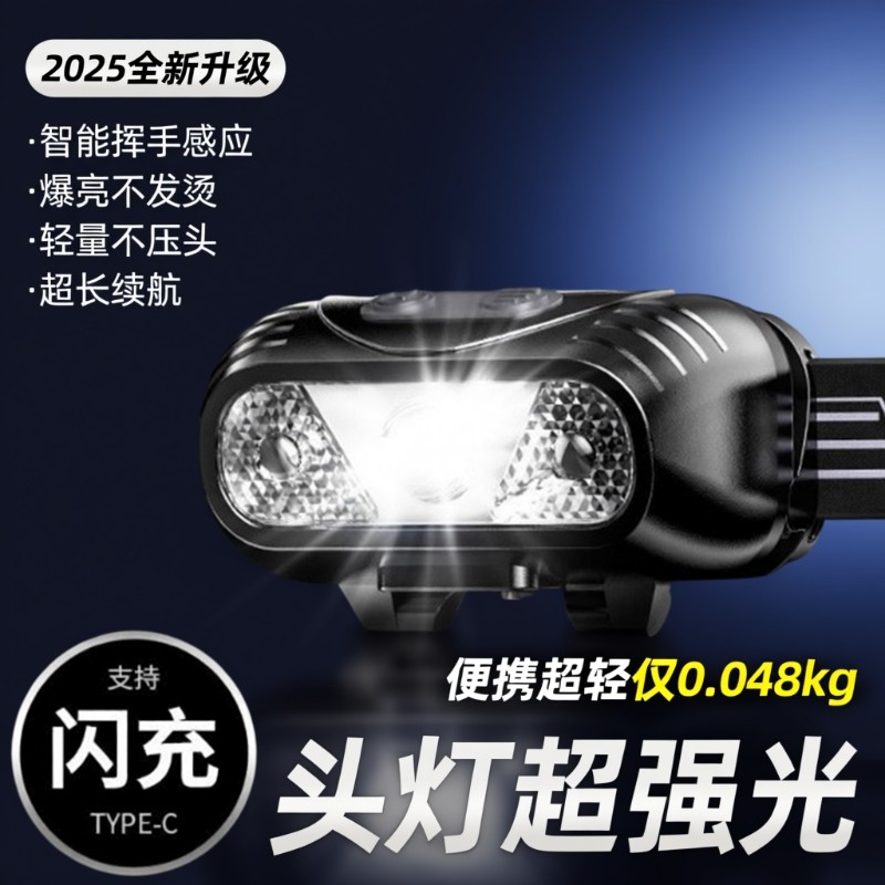 头灯2025新款强光超亮充电头戴式照明灯矿灯户外钓鱼专用感应矿灯