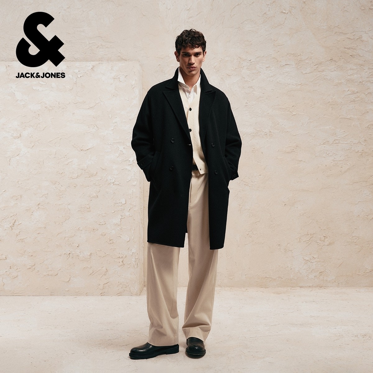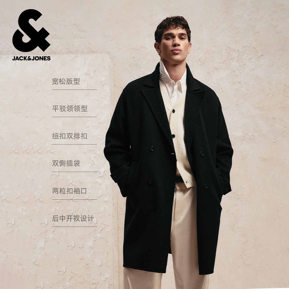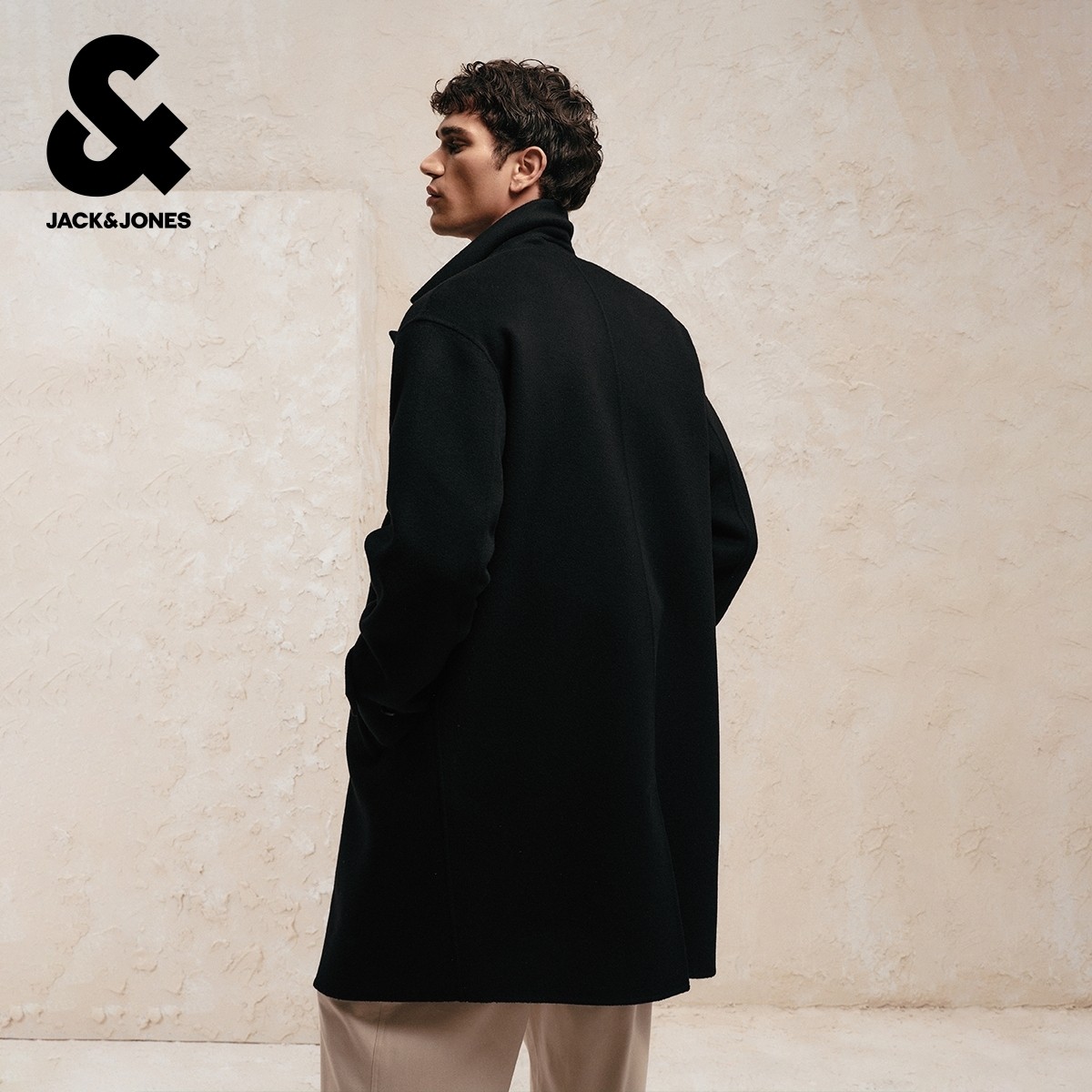 杰克琼斯奥特莱斯男装秋季毛呢大衣秋季黑色长款平驳领潮流外套