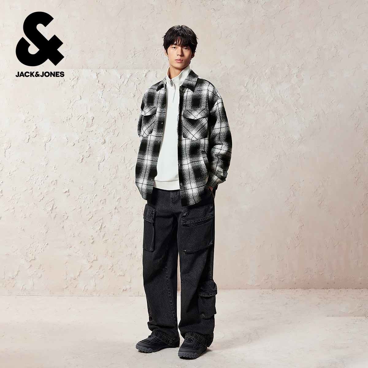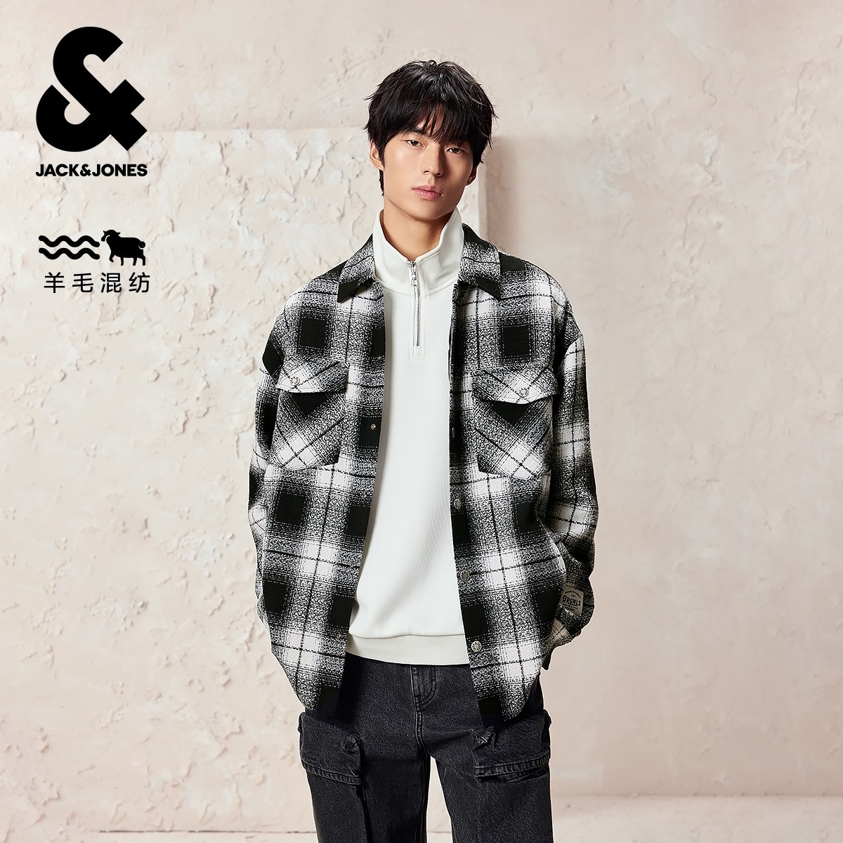杰克琼斯男装秋季毛呢大衣2025年新款翻领字母刺绣格纹长袖外套
