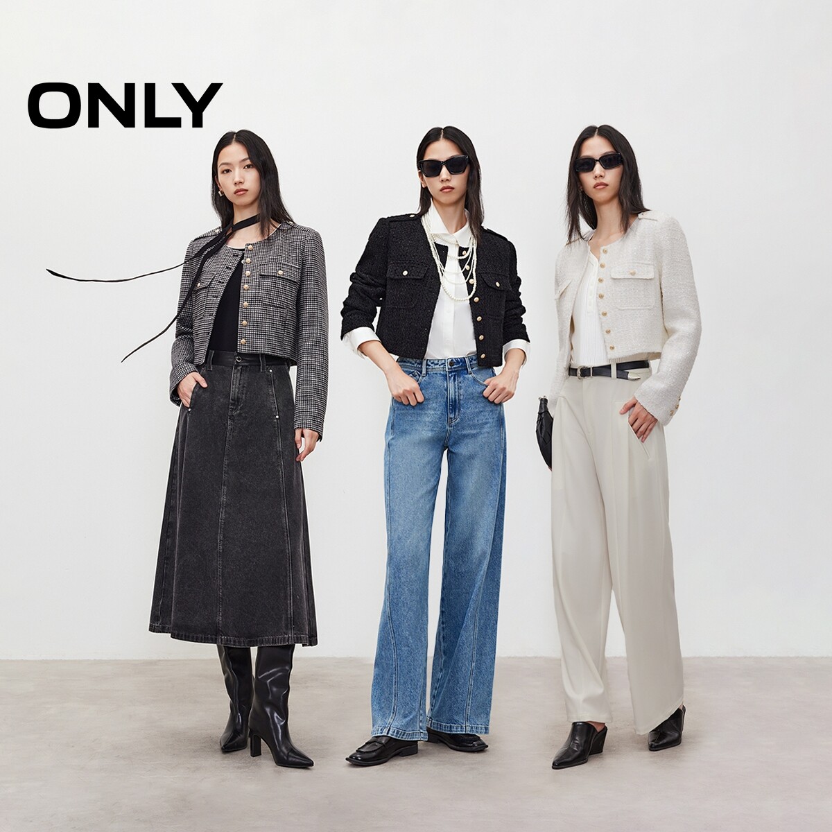 ONLY2025秋冬新款利落正肩短款金属纽扣粗花呢圆领小香风外套女