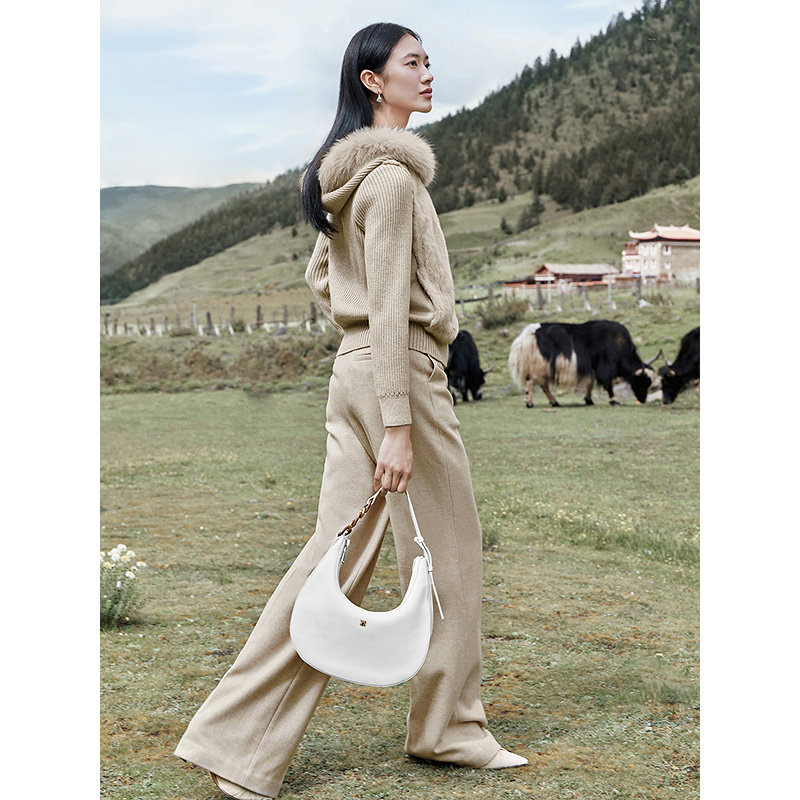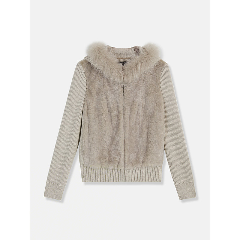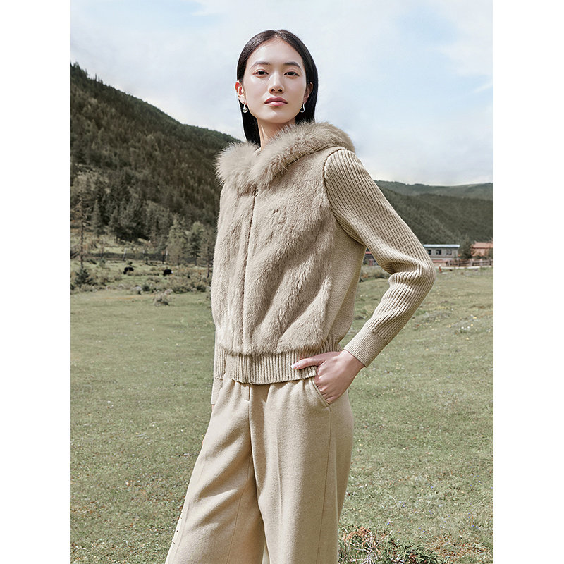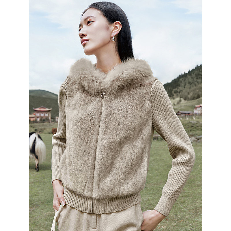 YINER音儿2025冬季新款水貂拼接羊毛混纺针织狐狸毛领皮草外套