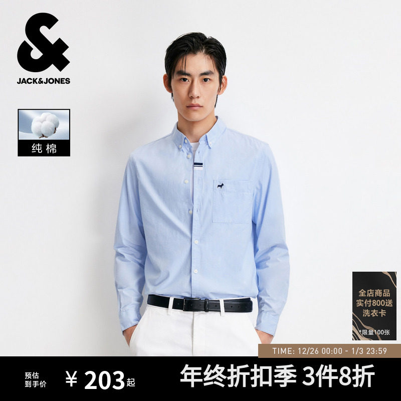 杰克琼斯男装衬衫夏秋季新款纯棉通勤休闲长袖黑白色衬衣面试伴郎