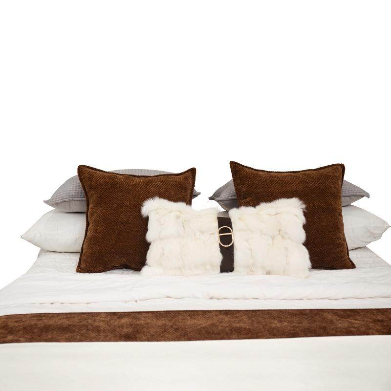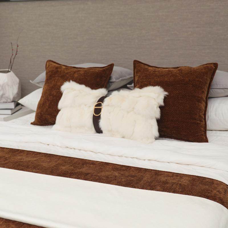 现代软装样板间床品狐狸毛抱枕设计师咖色售楼处床上搭毯靠垫