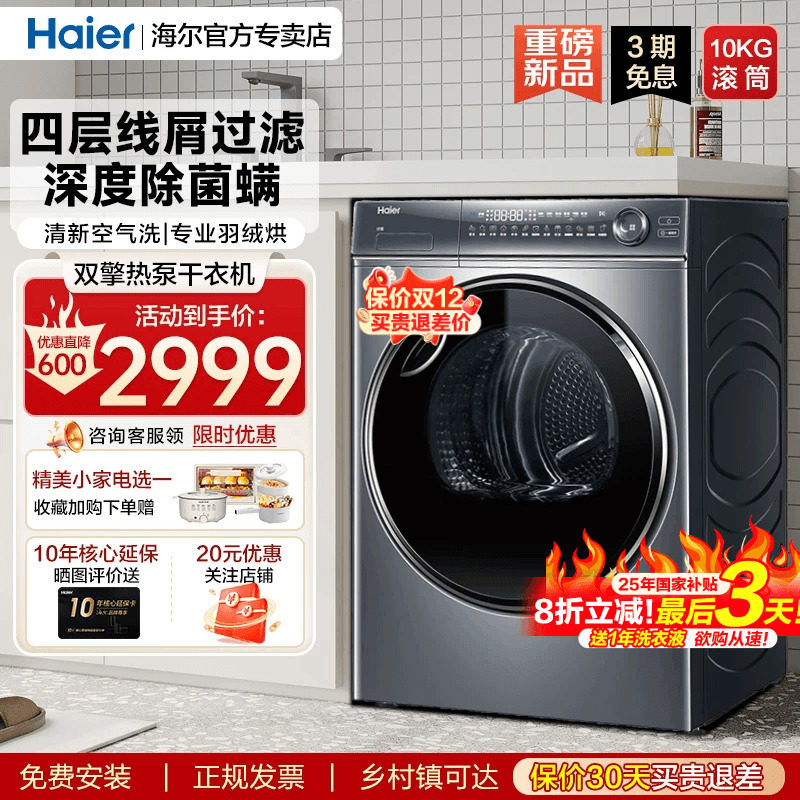 云溪4.0 海尔热泵烘干机77E家用全自动10kg变频双擎烘衣528干衣机