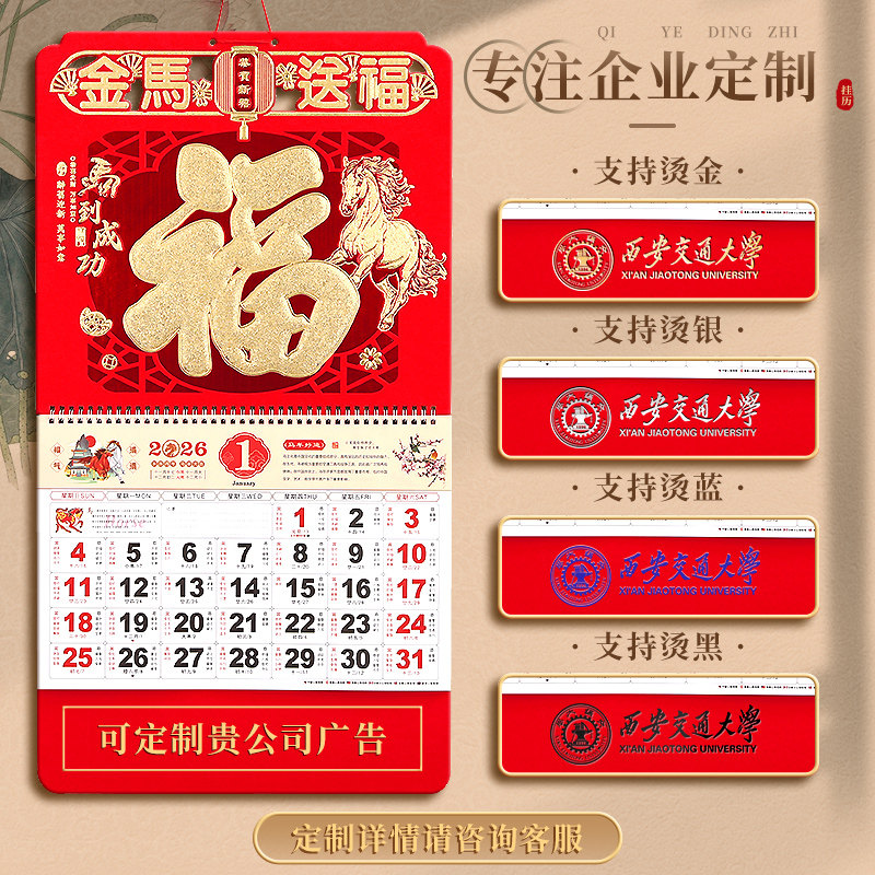 高档挂历2026年新款马年定制创意月历撕历定做正六开中国红精雕镂空工艺福牌家用挂墙式日历吊历公司企业logo