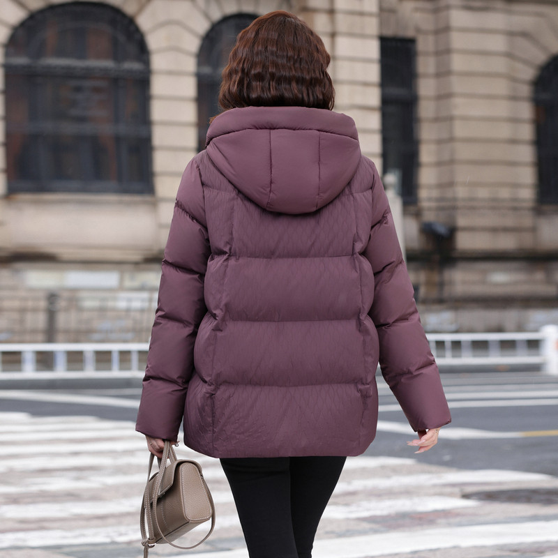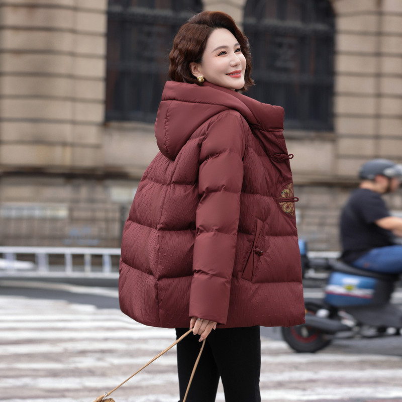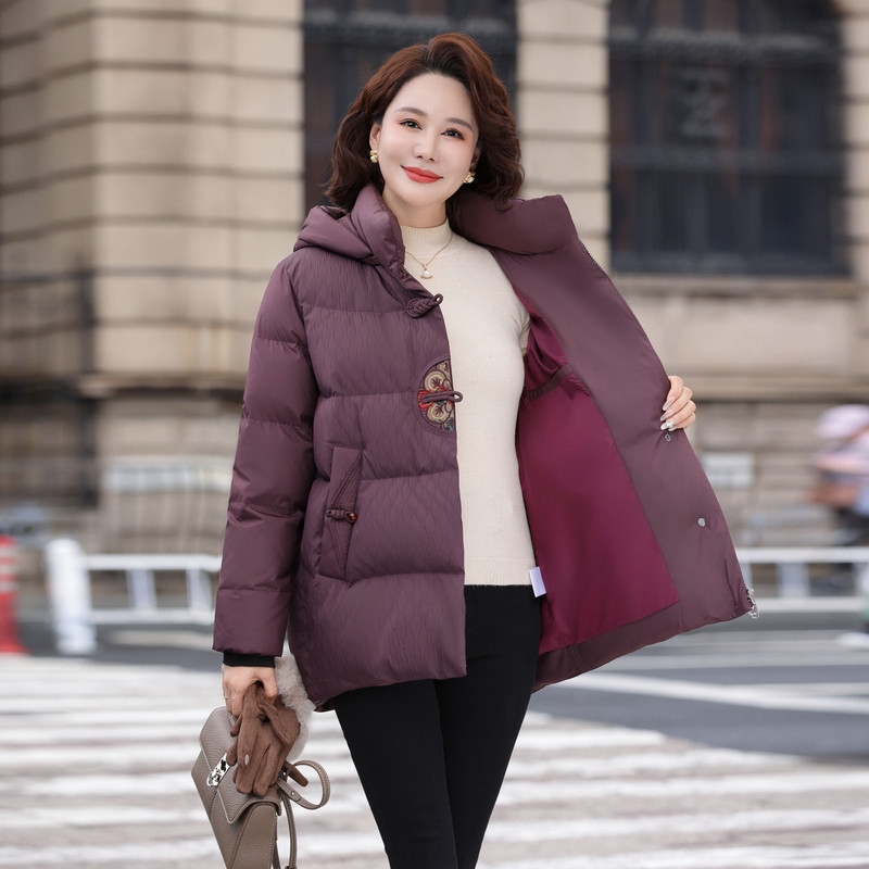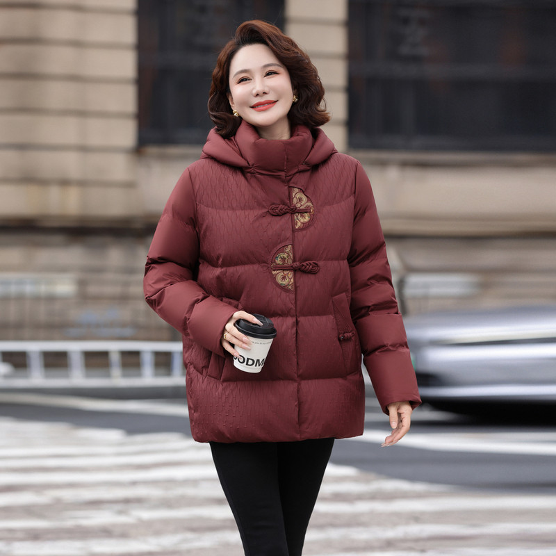 雪中飞2025冬新款新中式短款羽绒服女士妈妈花纹盘扣保暖洋红