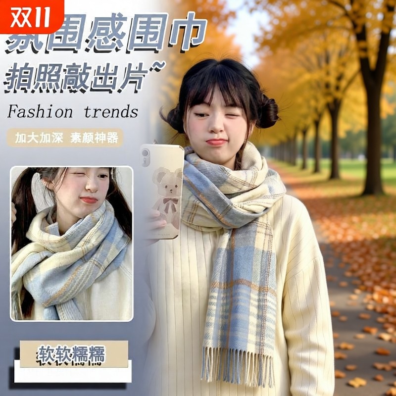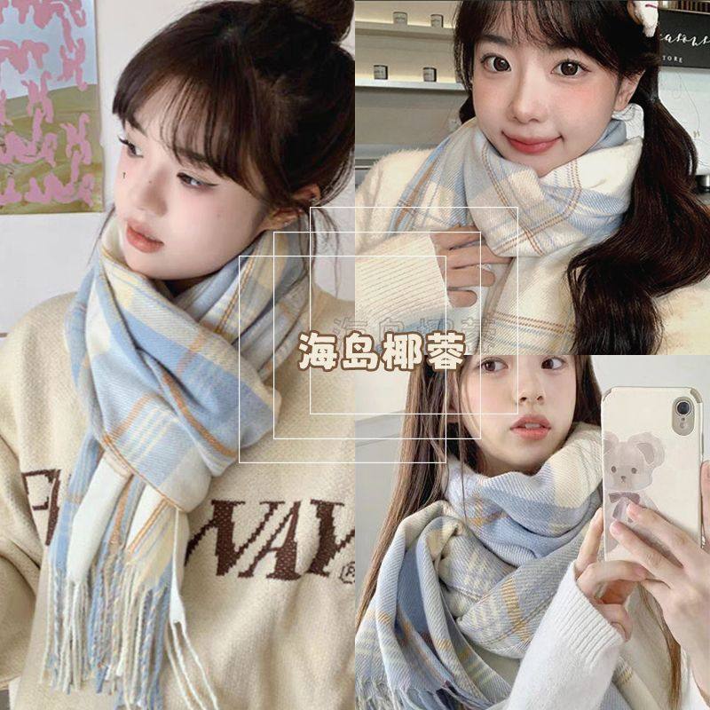 奶呼呼米色高级感格子围巾2025新款女冬季加厚围脖学生韩系氛围感