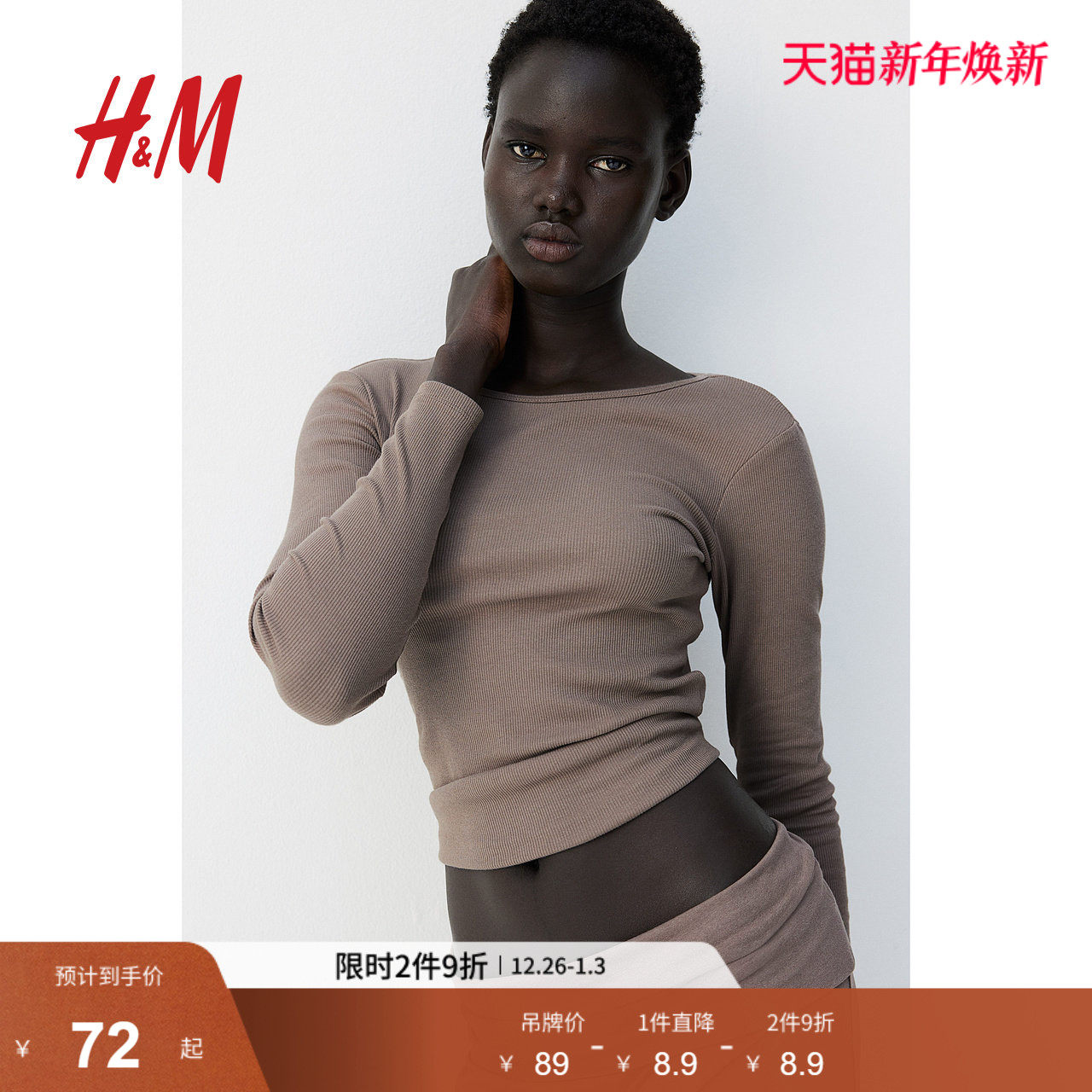 HM女装T恤冬季内搭时尚休闲棉质修身罗纹长袖上衣0996759