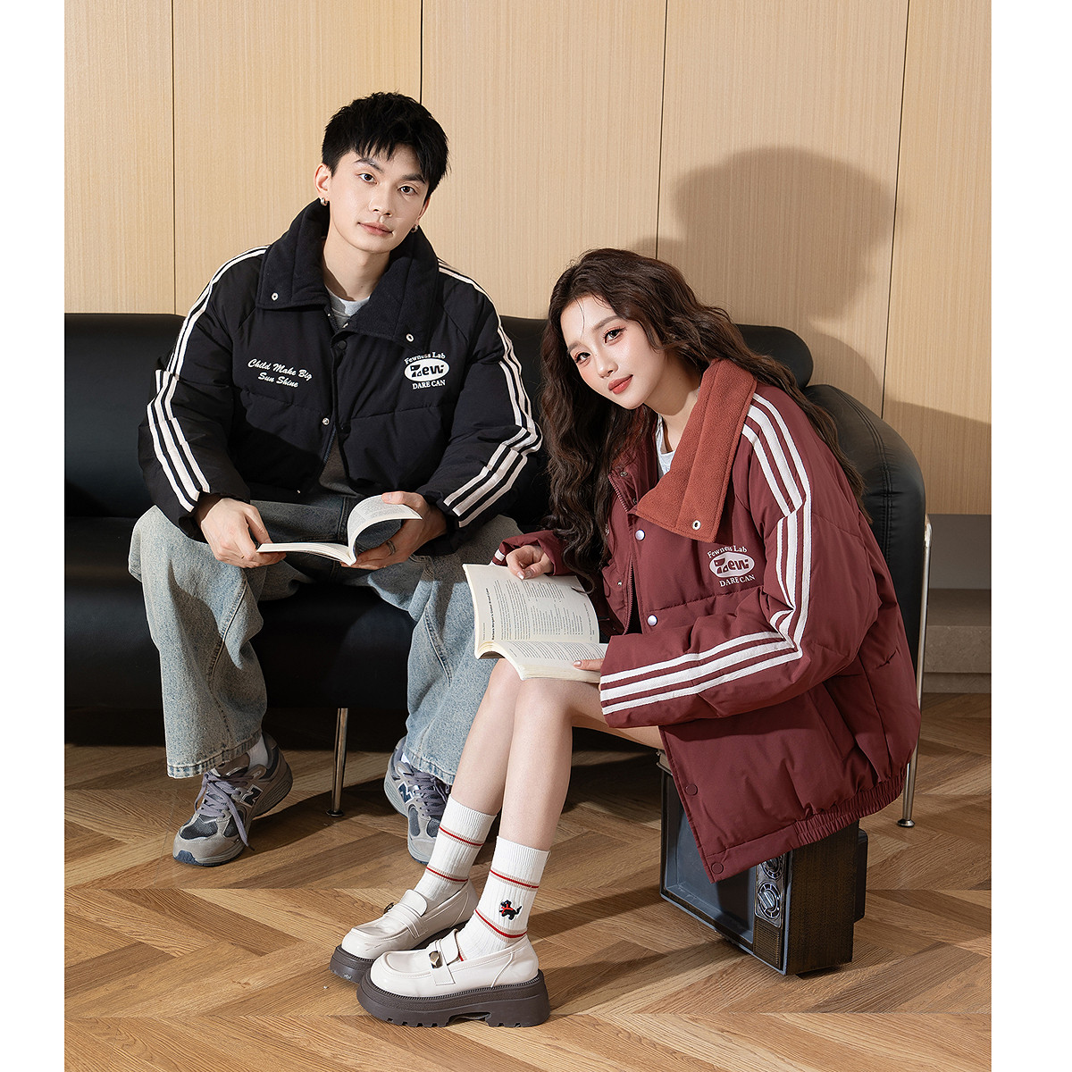 唐狮春季新款情侣棉衣翻领短款流行红色女棉服百搭黑色棉袄TD
