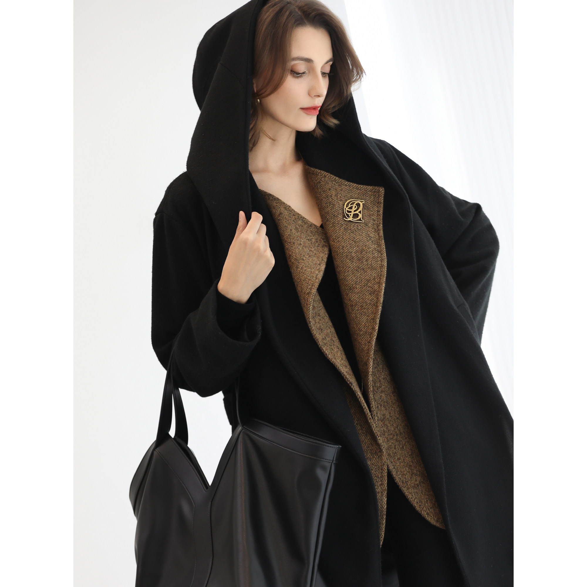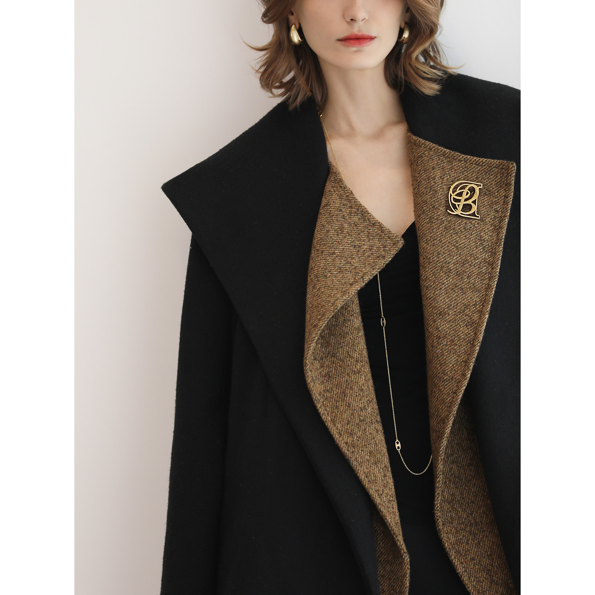COCOBELLA设计感假两件大翻领毛呢外套女新款黑色大衣WL0002