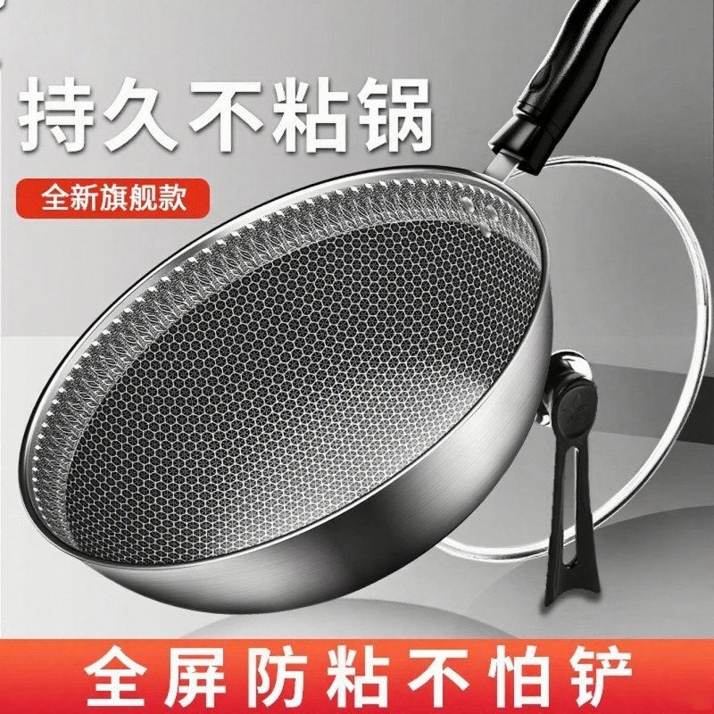 304加厚不粘锅炒锅家用炒菜锅平底电磁炉煤气灶专用不锈钢锅具